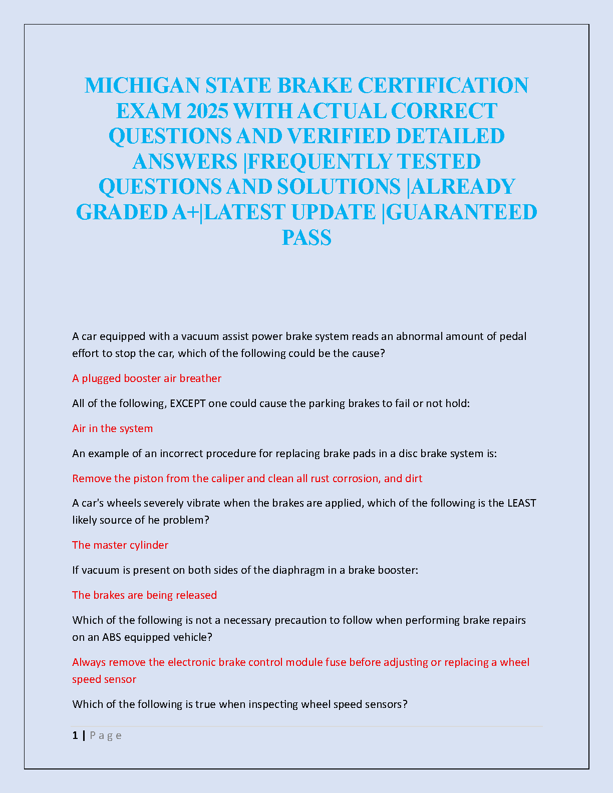 Michigan State Brake Certification Exam 2025 Test Bank: Verified Questions and A+ Graded Answers for Guaranteed First-Attempt Success