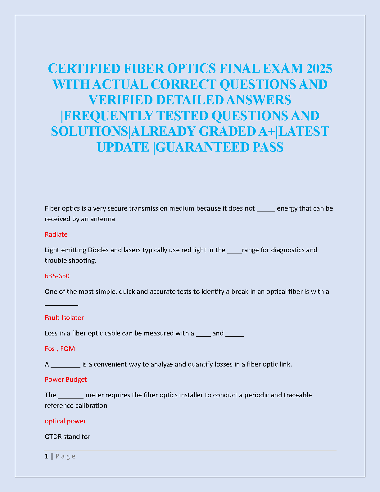Certified Fiber Optics Final Exam Test Bank 2025 | Latest Edition with Verified Questions and A+ Graded Answers