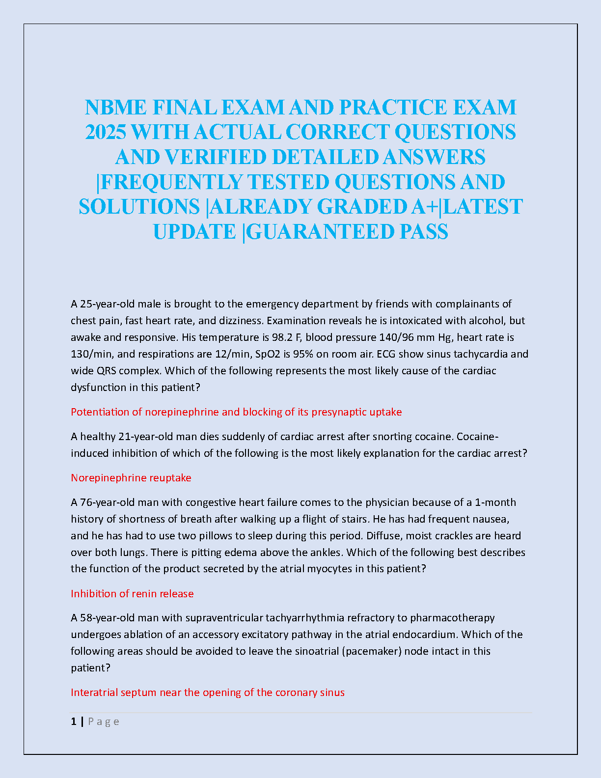 Ace your NBME Final Exam on the first try with our premier 2025/2026 study guide. This comprehensive resource is meticulously designed to ensure your success. It features an extensive collection of frequently tested questions and actual exam scenarios, each paired with verified, detailed answers and in-depth solutions. Our material is already A+ graded, providing you with the most accurate and effective preparation tool available. Don't just study—master the concepts and walk into your exam with the confidence of a guaranteed pass. Avoid resits and secure your top score with this essential NBME test bank.