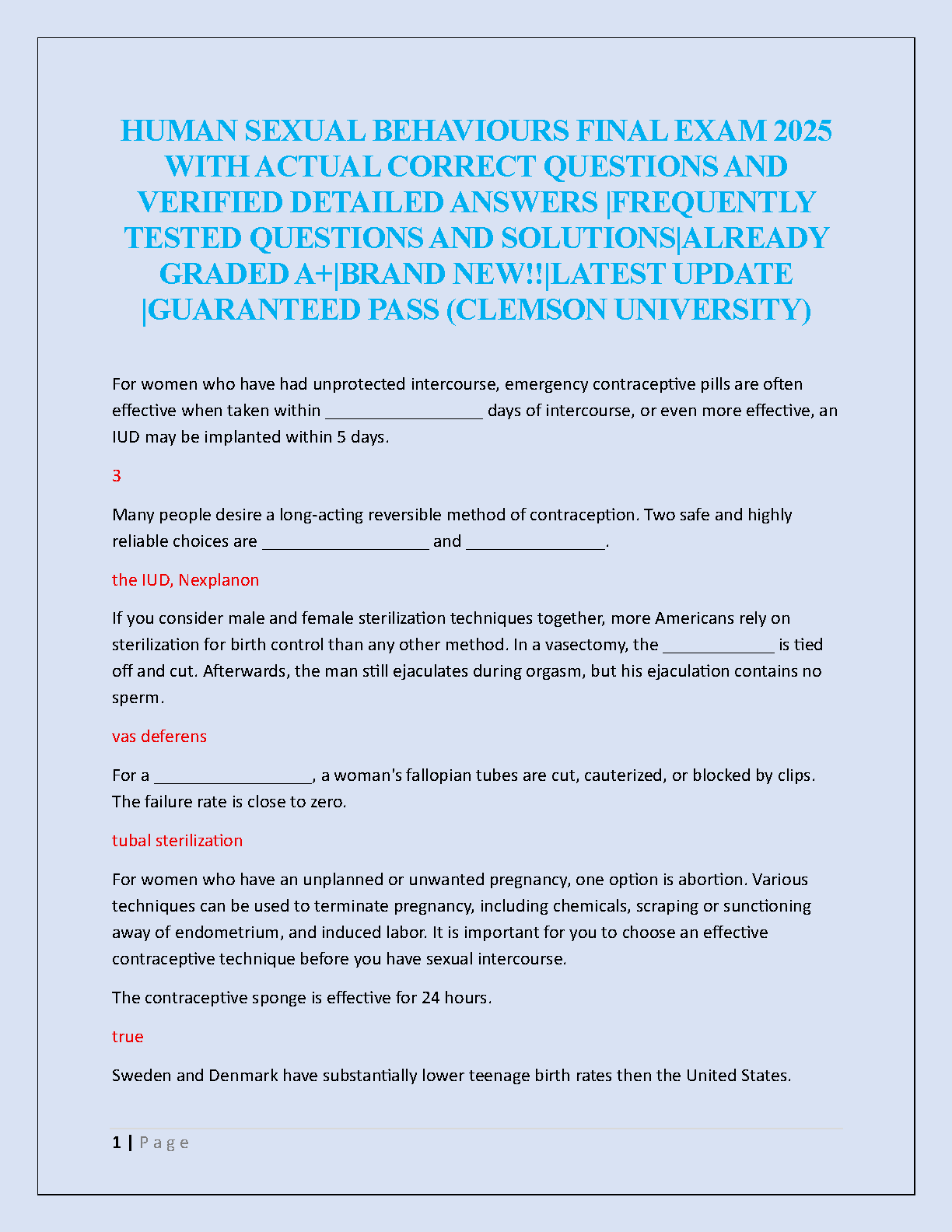 Ace your Human Sexual Behaviours final exam at Clemson University with this comprehensive 2025 test bank. This premium study resource features a collection of actual, frequently tested exam questions, each paired with a detailed and verified correct answer. Designed to help you master key concepts from the course, likely based on the 'Our Sexuality' textbook by Crooks and Baur, this guide is your key to achieving an A+ grade. Stop cramming and start studying smart with solutions that guarantee a pass on your first attempt. Perfect for final exam preparation and ensuring you avoid resits.