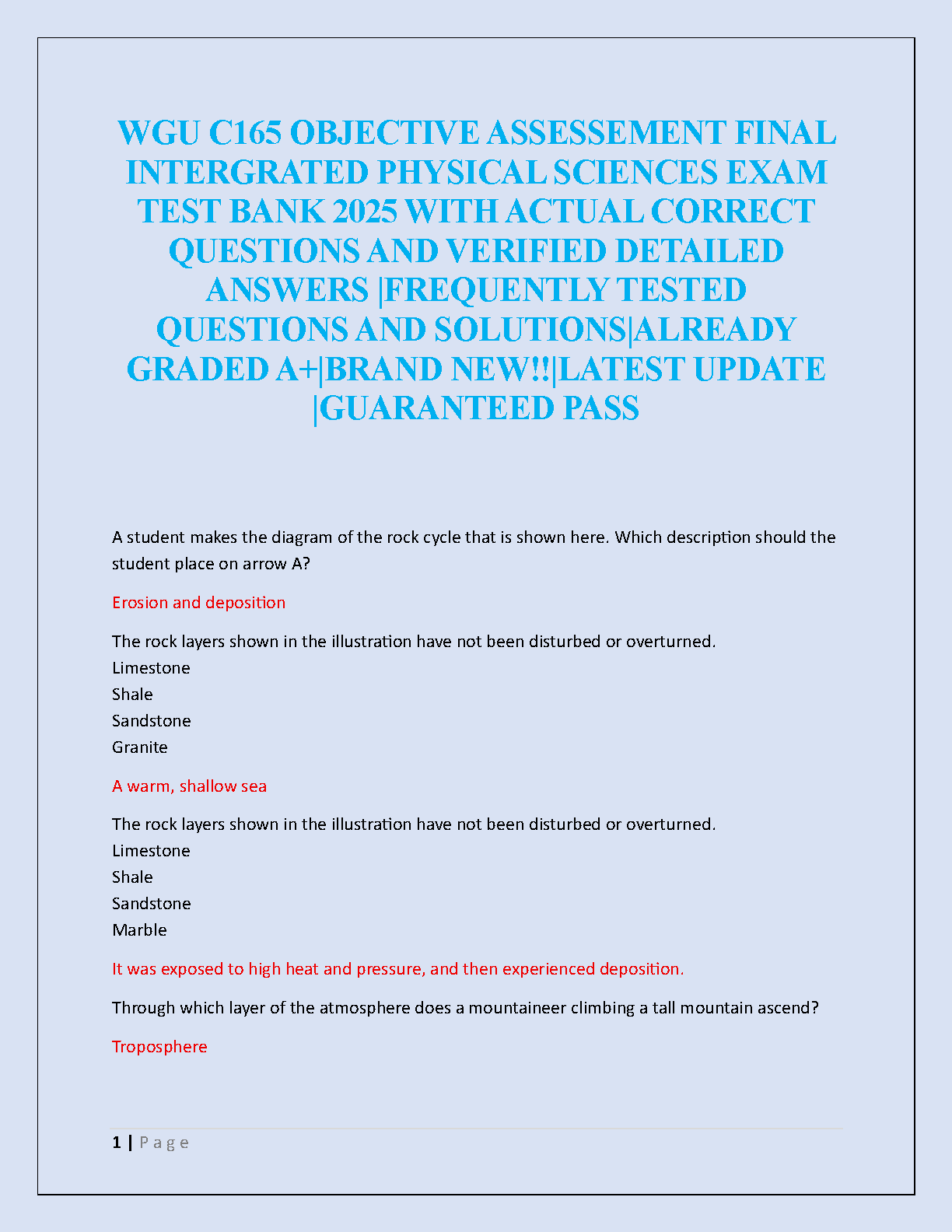 Unlock success in your WGU C165 Integrated Physical Sciences course with our comprehensive 2025 Test Bank for the final objective assessment. This study resource is meticulously compiled to ensure you pass on your first attempt and achieve an A+ grade. Inside, you'll find a complete collection of frequently tested questions, each accompanied by a verified, detailed answer. This is the latest and most up-to-date guide, designed to mirror the actual exam format and content. Prepare confidently and ace your WGU C165 final exam with this guaranteed pass solution.