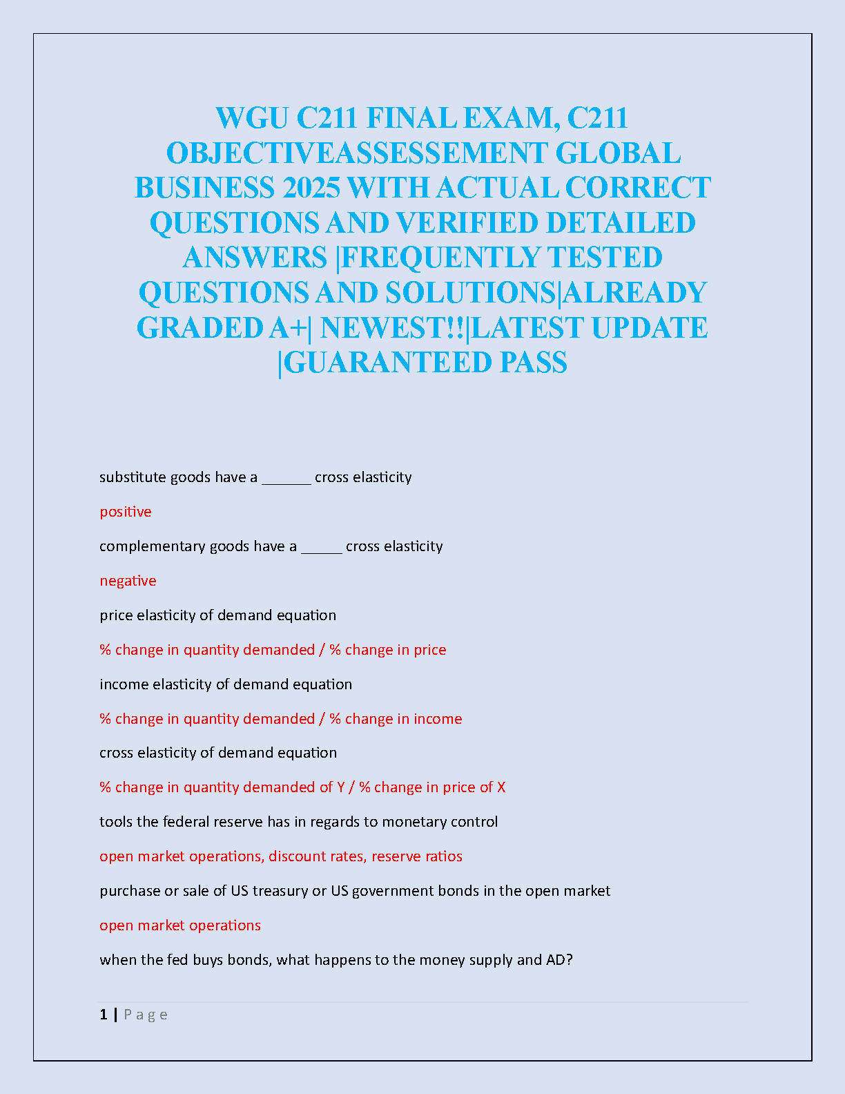Ace your WGU C211 Global Business final exam and objective assessment with our latest, comprehensive test bank for the 2025/2026 academic year. This A+ graded resource is meticulously crafted to ensure you pass on your first attempt. It features a complete collection of frequently tested questions paired with verified, detailed answers and solutions. Covering all essential topics from the C211 curriculum, including economic principles like cross-price elasticity and monetary policy tools, this study guide is your ultimate key to success. Stop worrying about resits and secure your A+ grade with this guaranteed pass package!