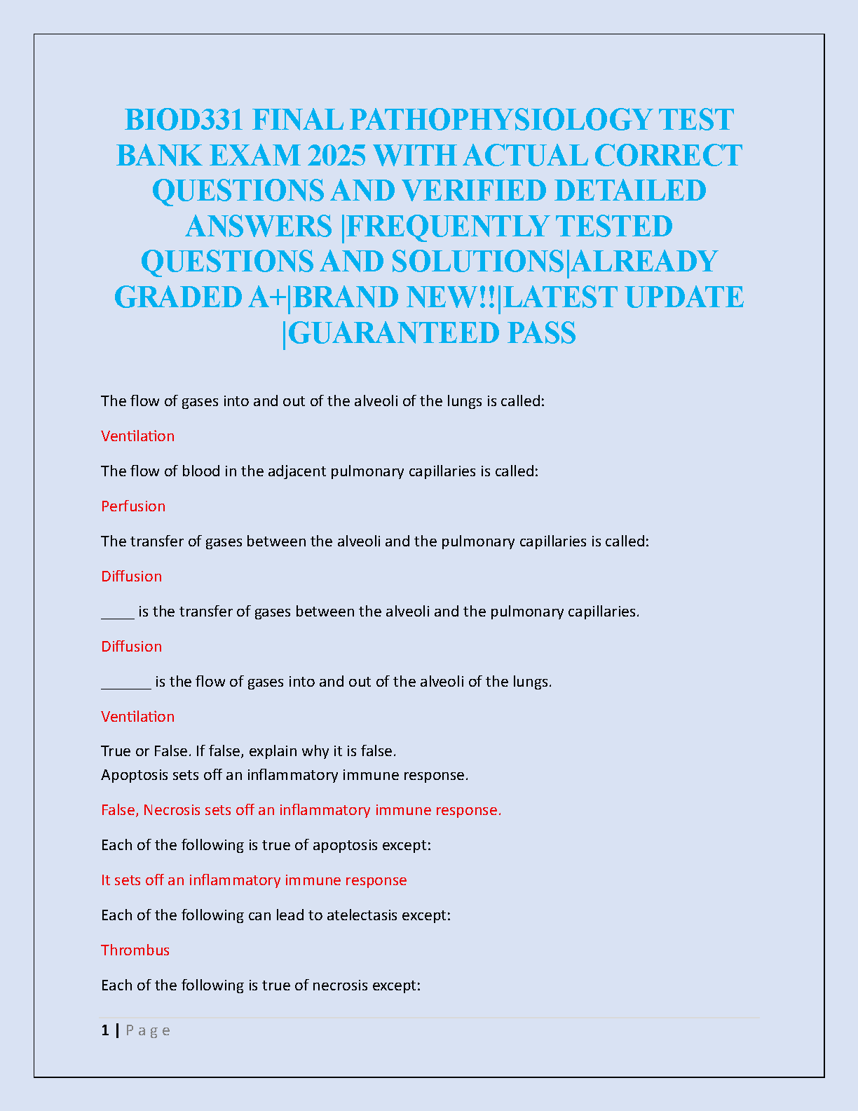 Excel in your BIOD331 Final Pathophysiology Exam with this premier A+ graded test bank for McCance and Huether's 'Pathophysiology: The Biologic Basis for Disease in Adults and Children,' 9th Edition. This latest 2025 updated resource is packed with a comprehensive collection of frequently tested questions, complete with verified and detailed answers. Master key concepts, understand complex disease processes, and walk into your exam with confidence. This study guide is your ultimate tool for a guaranteed pass, helping you ace the course on your first attempt.