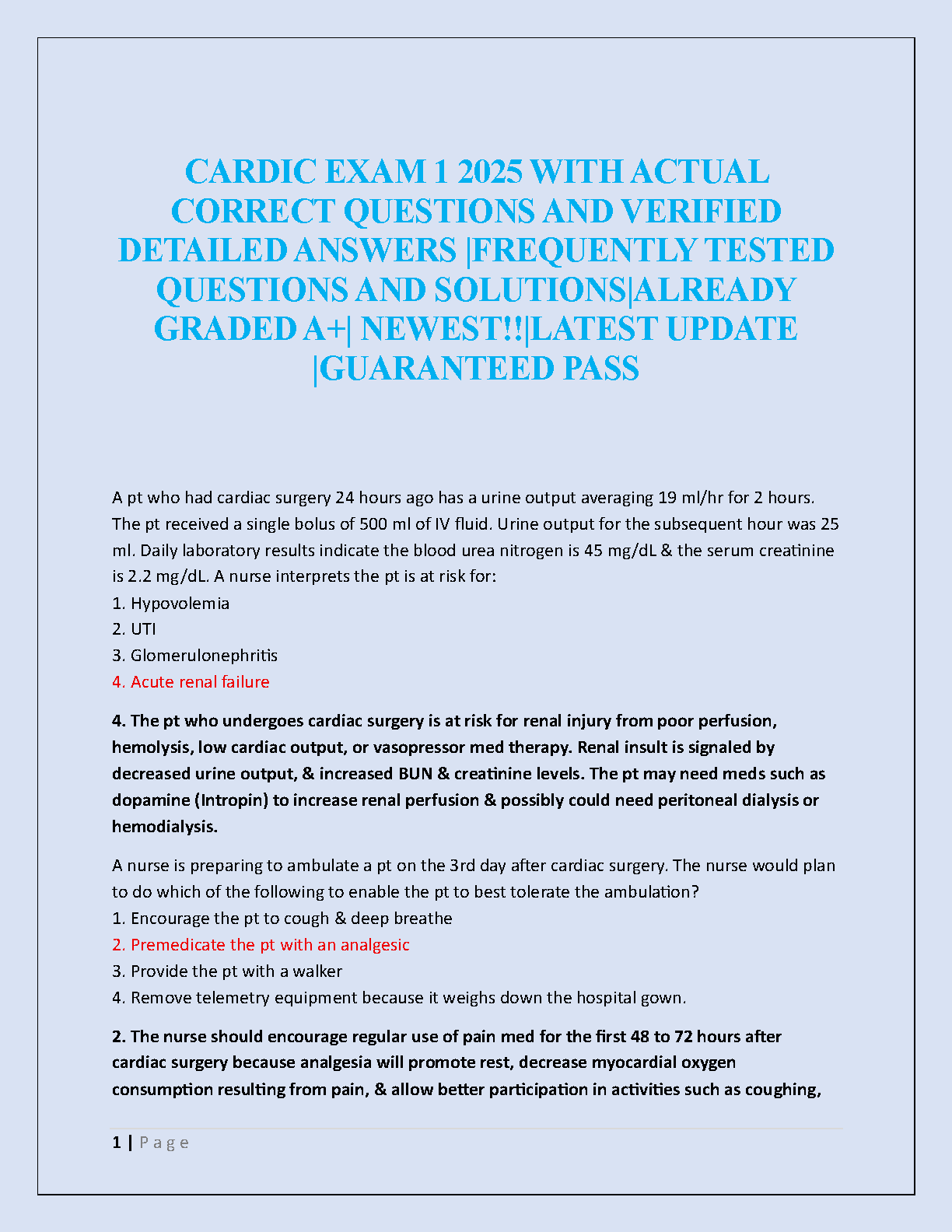 Ace your Cardiac Nursing course with our comprehensive Test Bank for Exam 1, fully updated for 2025. This A+ graded resource provides a complete collection of frequently tested questions, verified answers, and detailed solutions covering crucial topics in cardiac care. Master concepts like post-cardiac surgery management, identifying complications such as acute renal failure, and effective nursing interventions. Our expertly crafted materials are designed to give you the confidence you need to pass your exam on the first try and excel in your studies. Stop struggling and start succeeding with this guaranteed-pass study guide.