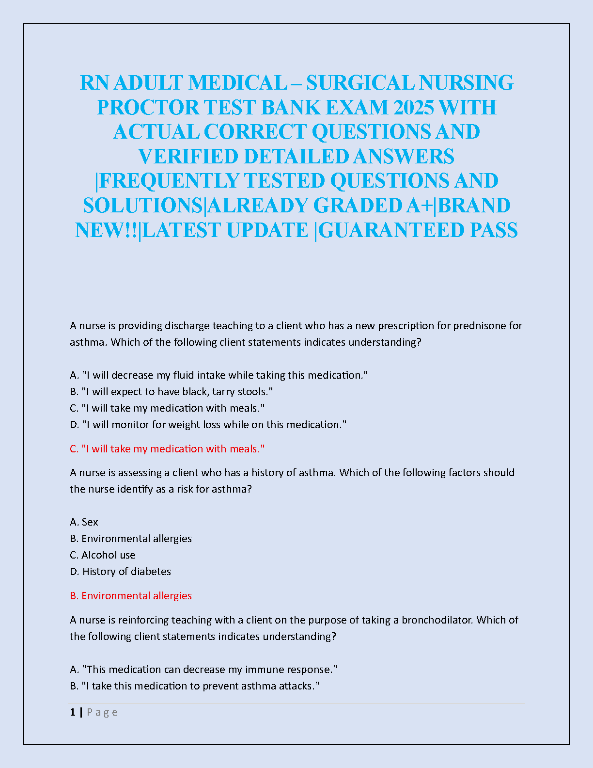 Get ready to excel in your nursing program with the ultimate study resource: the RN Adult Medical-Surgical Nursing Proctor Test Bank for the 2025 exam season. This comprehensive guide is packed with the latest, frequently tested questions and meticulously verified answers. Each question is designed to reflect the actual proctor exam, helping you build confidence and master critical concepts. Stop struggling and start studying smarter with this A+ graded material, your key to a guaranteed pass on the first try.