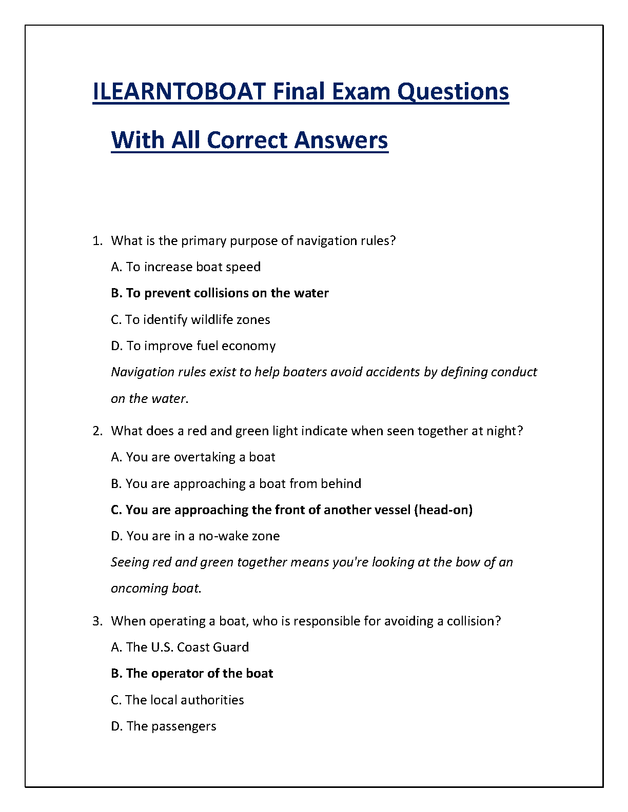 Master the ILEARNTOBOAT final exam and get your boating license with confidence! This comprehensive test bank provides a complete set of questions and verified answers, covering all critical topics from the official boater safety course. From navigation rules and boat handling to safety equipment and emergency procedures, this study guide is your ultimate resource. Prepare effectively, understand the key concepts, and pass your exam on the very first attempt. Stop worrying and start boating safely!