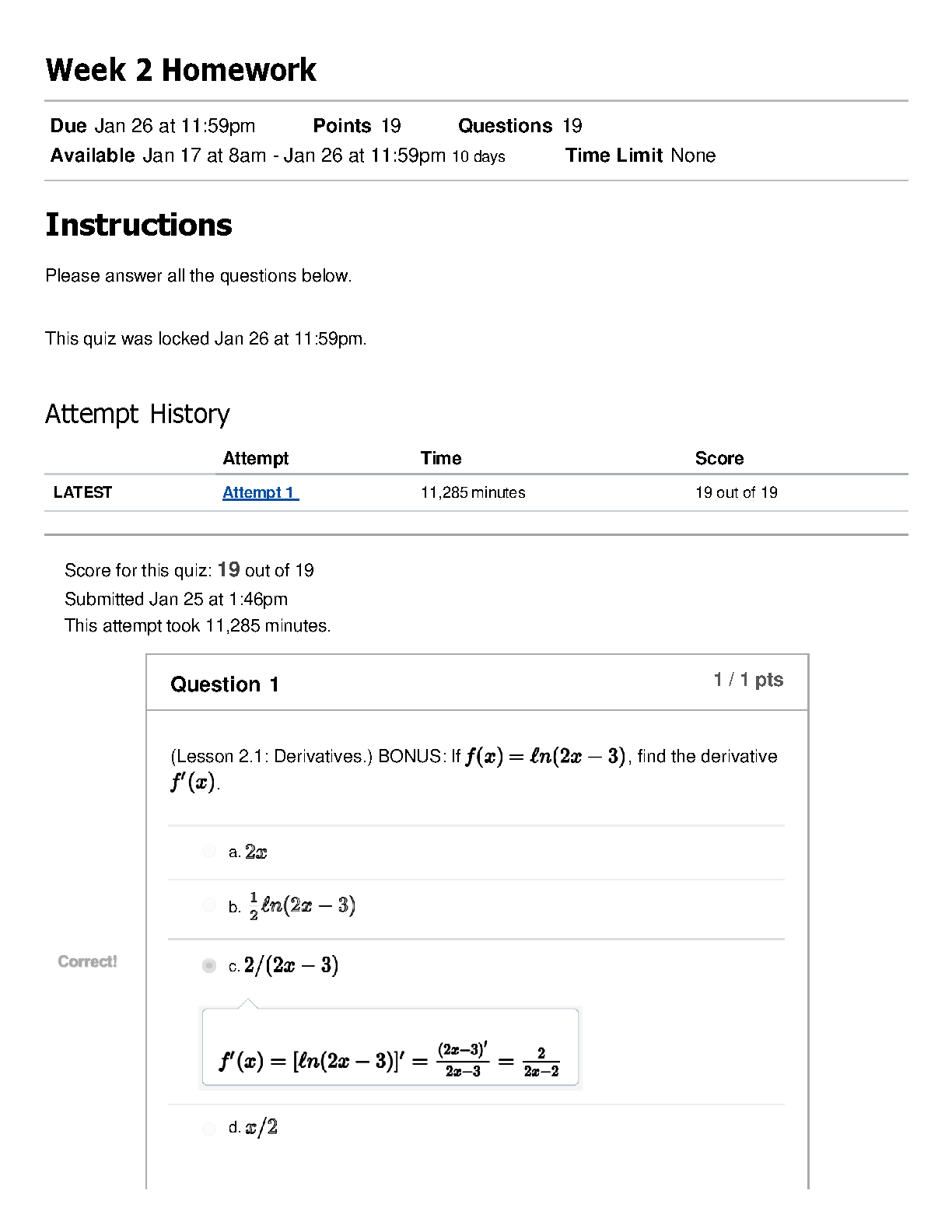 Struggling with Calculus? Ace your Week 2 homework and exams with this comprehensive test bank. This resource provides detailed, step-by-step solutions for a 19-question quiz on Derivatives, based on Lesson 2.1. Achieve a perfect score just like in this A+ graded example. An essential study guide for any student looking to master derivatives and pass their calculus course with confidence.