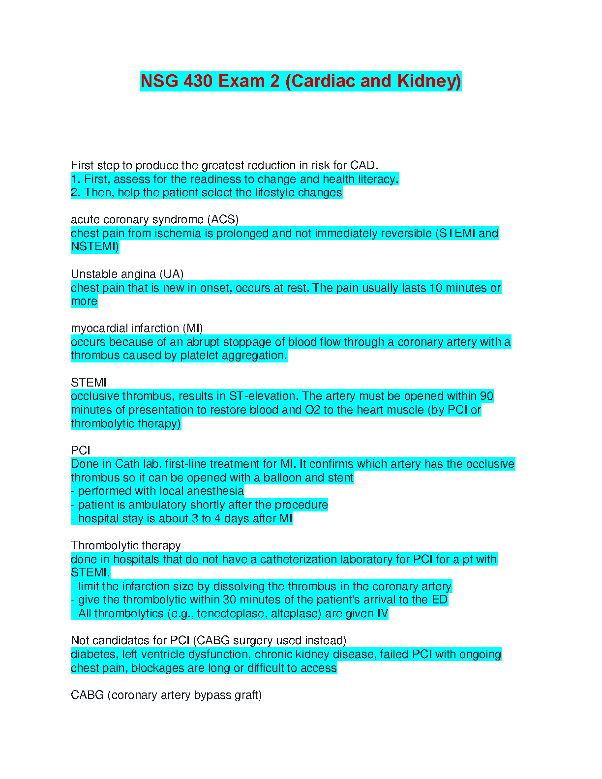 Unlock success in your NSG 430 course with our meticulously crafted study guide for Exam 2, focusing on Cardiac and Kidney systems. This latest 2025/2026 resource breaks down complex topics into easy-to-understand notes, covering everything from Acute Coronary Syndrome (ACS) and Myocardial Infarction (MI) to advanced treatments like PCI and thrombolytic therapy. Designed for nursing students aiming to excel, this guide provides the essential knowledge needed to pass your exam confidently on the first attempt and avoid resits. Get the grade you deserve!