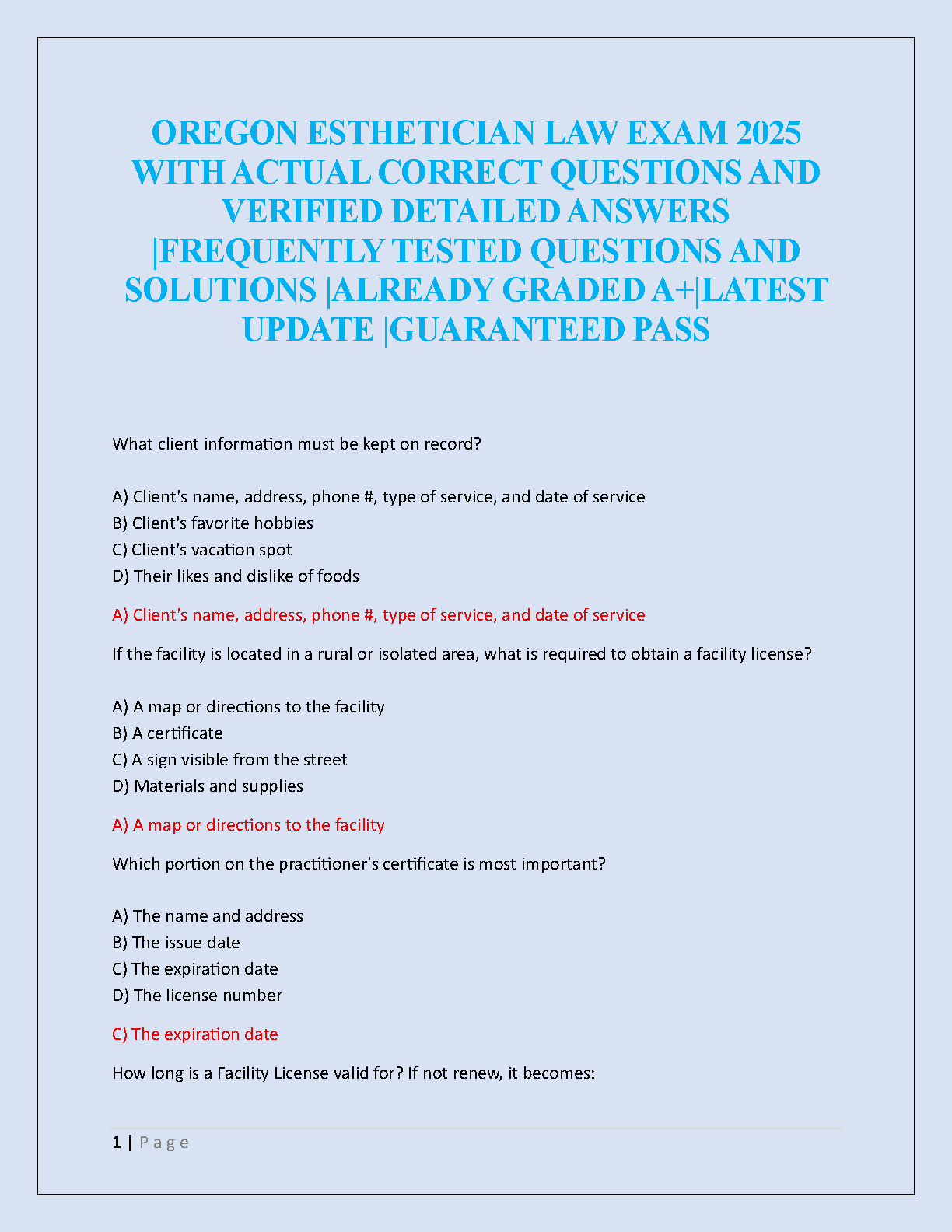 Master the Oregon Esthetician Law Exam for 2025 with our premier test bank, specifically designed to help you pass on your first attempt. This comprehensive study guide features a collection of actual, frequently tested questions complete with verified, detailed answers. Our resource is already A+ graded, providing you with the most reliable and up-to-date material for the 2025/2026 academic year. Secure your license without the stress of resits. This is the ultimate tool for a guaranteed pass and a confident exam day experience.