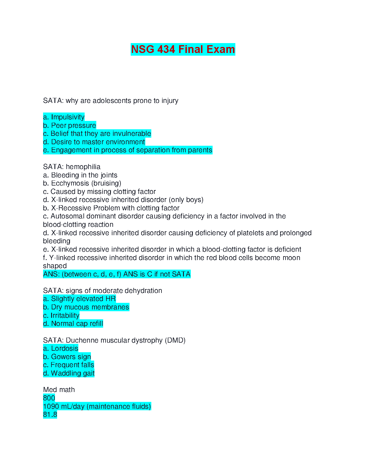 Ace your NSG 434 final exam with this comprehensive test bank focused on Child Health and Pediatric Nursing. This essential study resource provides a wide array of practice questions, including challenging SATA (Select All That Apply) formats, covering critical topics such as adolescent health risks, hemophilia, signs of dehydration, Duchenne muscular dystrophy (DMD), and essential medication math calculations. Each question comes with a verified, highlighted answer, making it the perfect tool to test your knowledge, identify areas for improvement, and build confidence before the exam. Download now to streamline your study process and pass your NSG 434 course with flying colors.