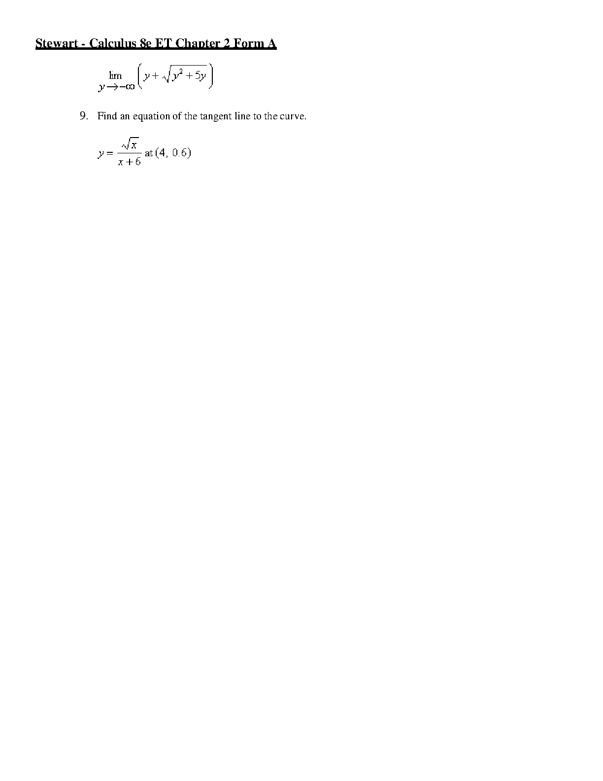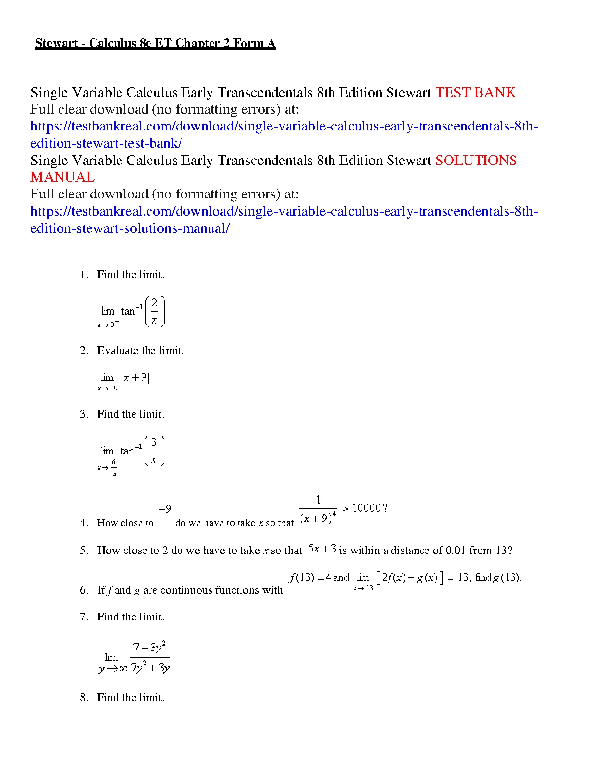 Test Bank For Calculus 8th Edition ET Chapter 2 Form A BY Stewart