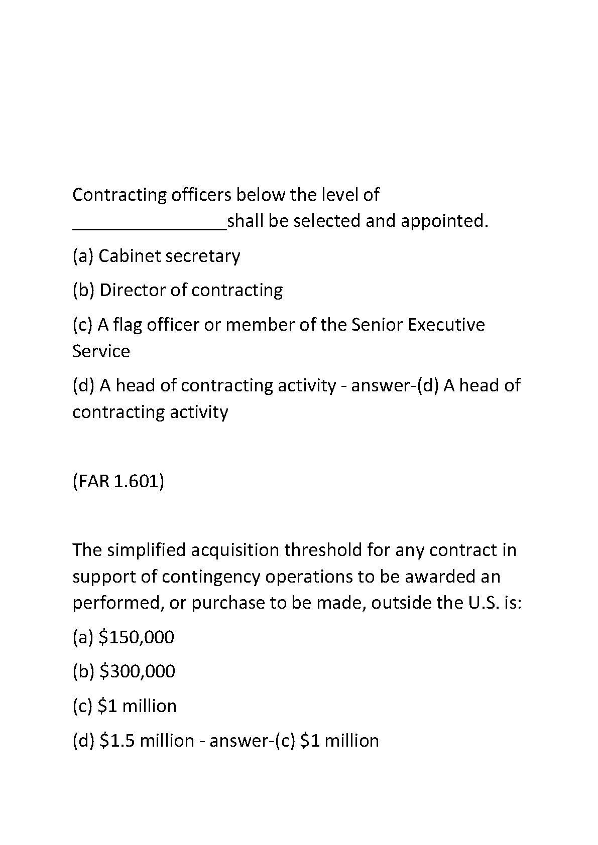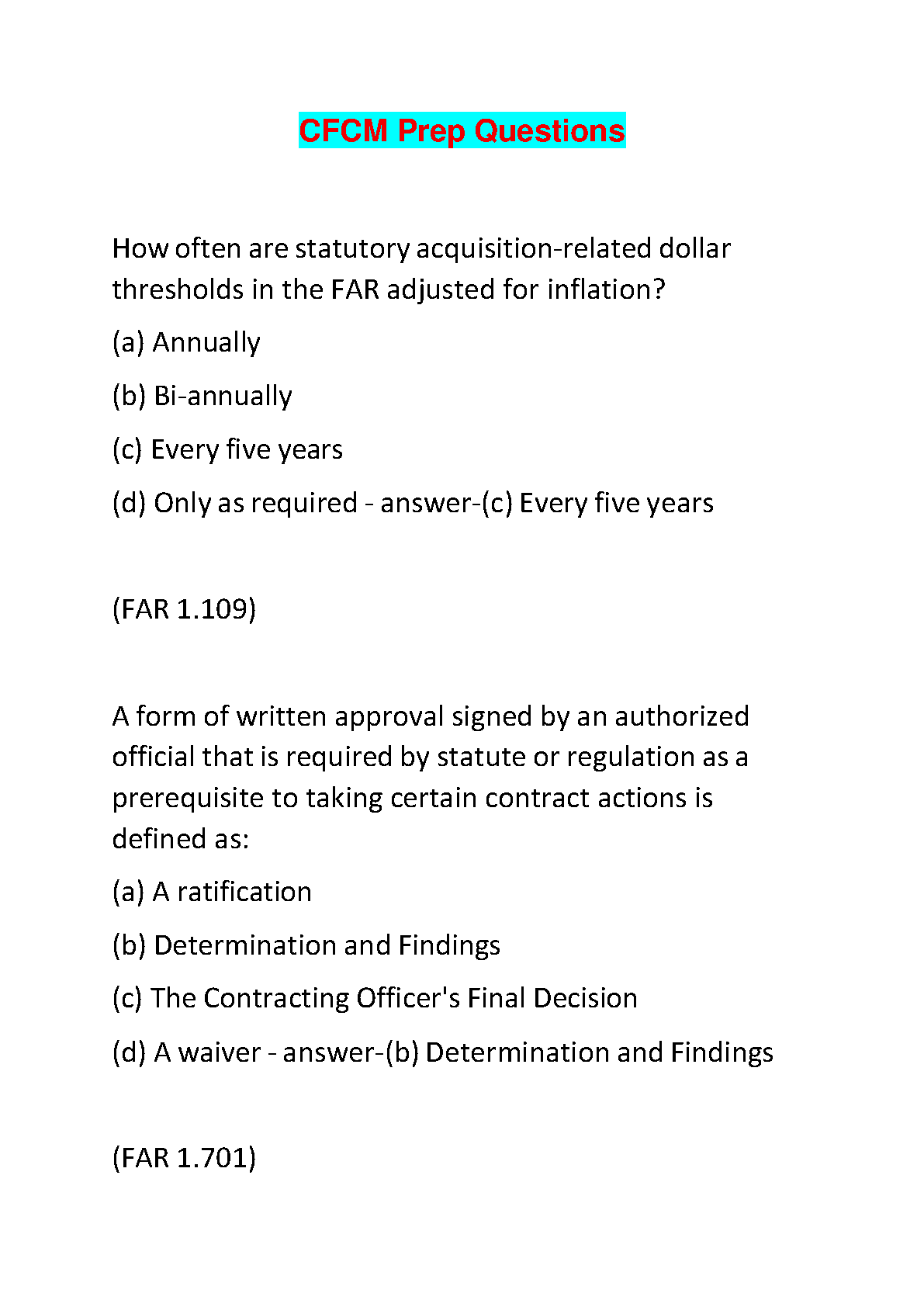 Prepare to excel in your Certified Federal Contracts Manager (CFCM) certification exam with our comprehensive 2025/2026 test bank. This essential study resource provides a targeted collection of practice questions and verified answers, mirroring the actual exam format. Delve into crucial topics from the Federal Acquisition Regulation (FAR), such as statutory thresholds and contract approvals, to build your confidence and mastery. Designed to help you pass on your first attempt, this test bank is your key to achieving CFCM certification and advancing your career in federal contract management without the stress of resits.