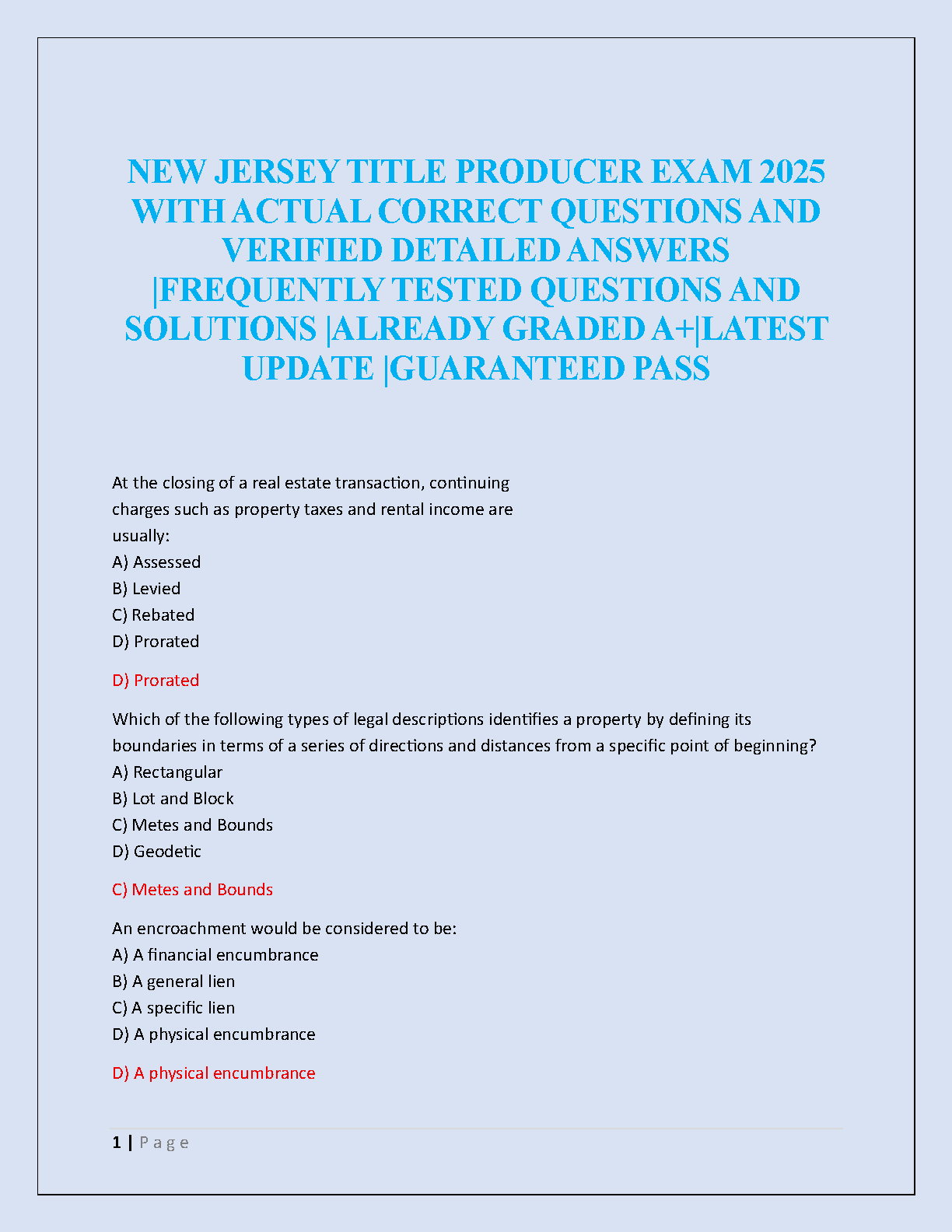 Ace your New Jersey Title Producer Exam on the first try with our comprehensive 2025 test bank. This resource is packed with a wide range of actual, frequently tested questions and provides verified, detailed answers for each one. Every question and solution has been carefully curated and is already graded A+, ensuring you study with the most accurate and up-to-date material available. Designed to guarantee your success, this study guide helps you master the key concepts, avoid resits, and confidently earn your license. Get the latest update and pass with flying colors!