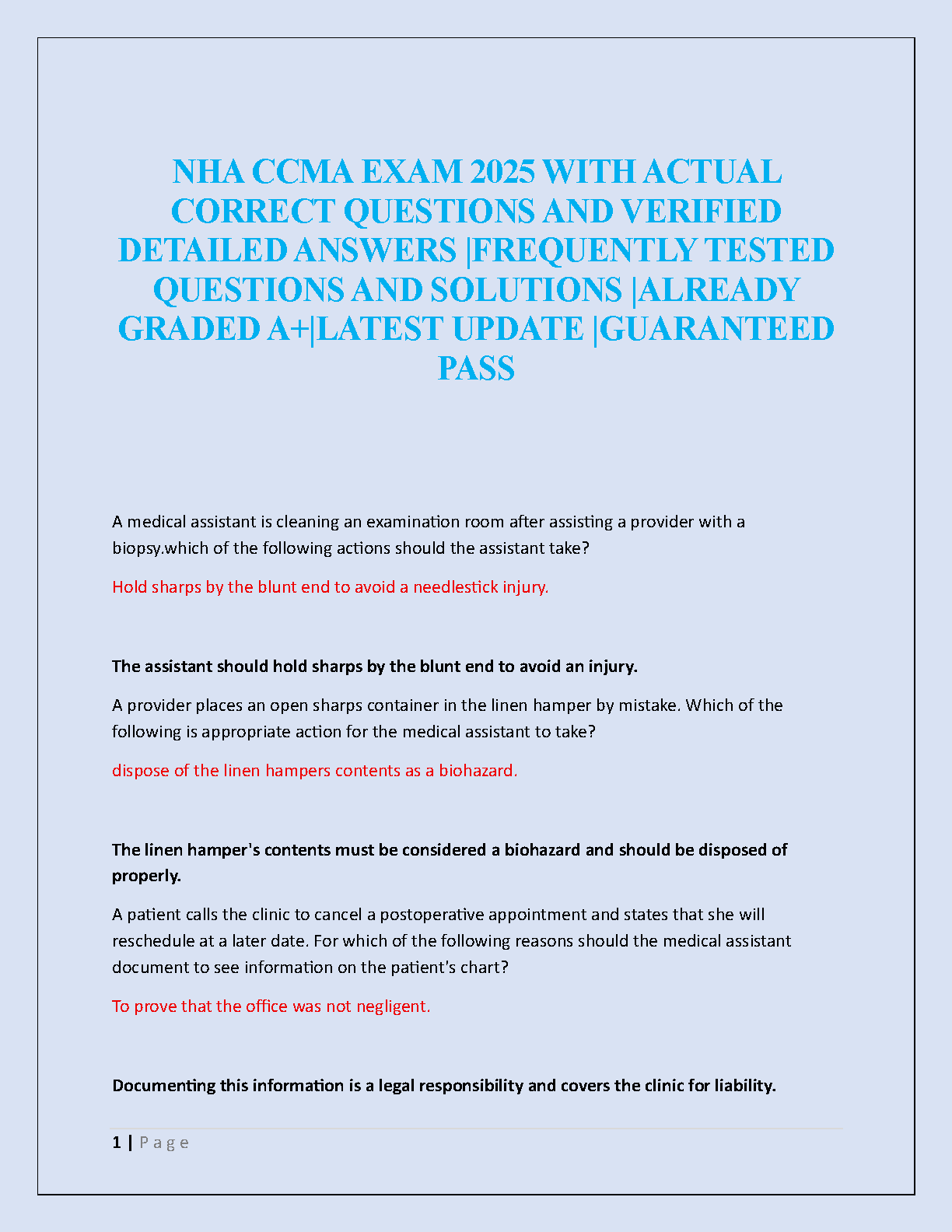Prepare to ace your National Healthcareer Association (NHA) Certified Clinical Medical Assistant (CCMA) exam on the first attempt with our latest 2025 test bank. This comprehensive study guide is meticulously compiled with actual, frequently tested exam questions and detailed, verified answers. Each solution is explained thoroughly to ensure a deep understanding of the concepts. Already graded A+, this resource is your key to success, providing the most up-to-date material to help you study effectively and pass with confidence. Don't risk a resit; get the study guide designed for a guaranteed pass!