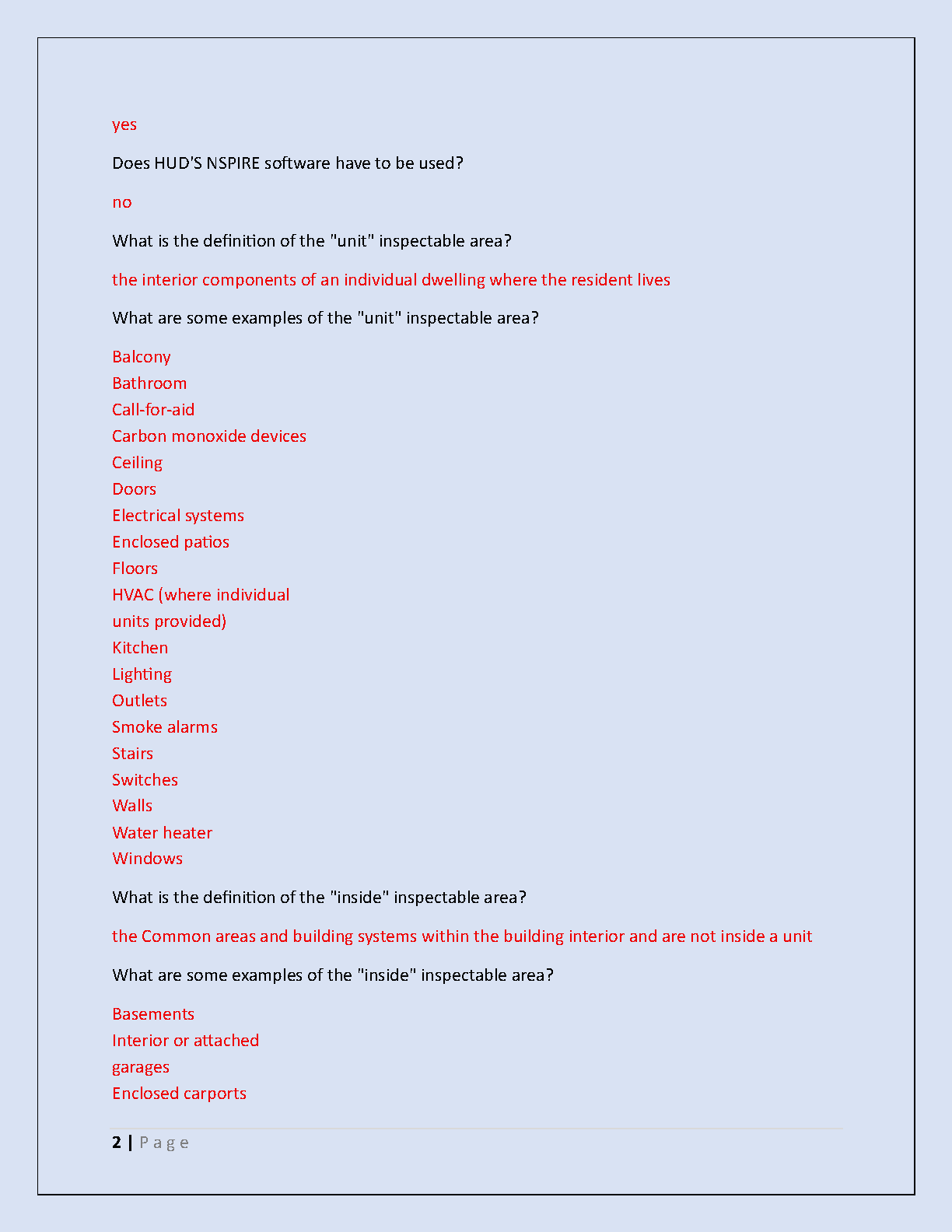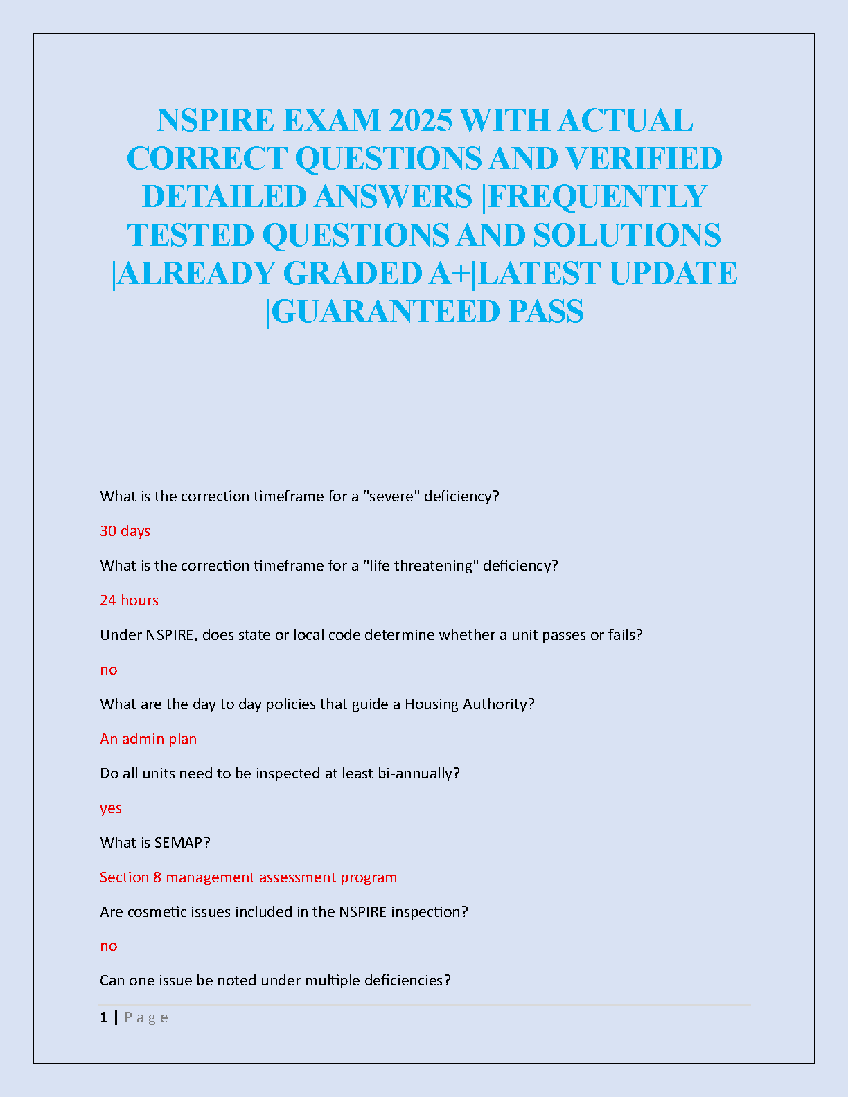 Ace the National Standards for the Physical Inspection of Real Estate (NSPIRE) exam with our comprehensive 2025 test bank. This study guide is meticulously crafted with verified questions and detailed, accurate answers that cover the most frequently tested concepts. Designed to ensure you pass on your first attempt, this A+ graded resource covers critical topics like deficiency correction timeframes and SEMAP, helping you build the confidence needed for success. Get the latest materials and avoid resits with this essential preparation tool.