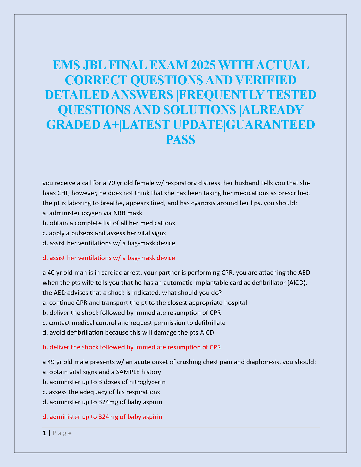 Unlock exam success with the latest 2025 EMS JBL Final Exam Test Bank, meticulously compiled from 'Emergency Care and Transportation of the Sick and Injured,' Twelfth Edition by the American Academy of Orthopaedic Surgeons (AAOS) and Andrew N. Pollak. This indispensable resource features a complete collection of frequently tested questions, each with a detailed, verified answer and rationale. Designed to help you master critical concepts and real-world scenarios, this A+ graded guide is your key to passing your final exam with confidence. Get the most up-to-date material and ace your EMS certification on the first try!