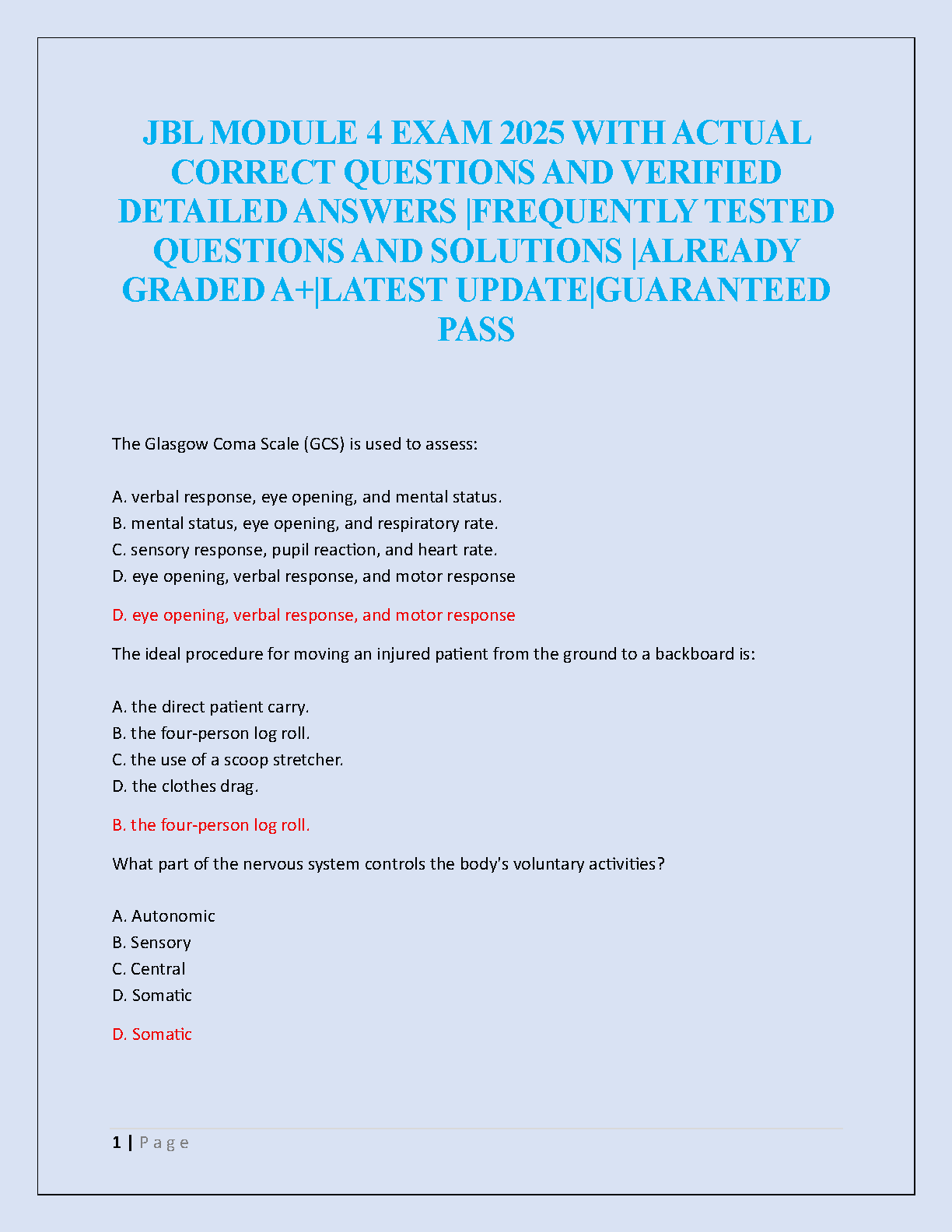 Ace your JBL Module 4 Exam with our comprehensive 2025 Test Bank! This essential study guide, based on the AAOS Emergency Care curriculum, is packed with actual exam questions and verified, detailed answers. Covering crucial topics like the Glasgow Coma Scale (GCS), patient handling, and nervous system functions, this resource is your key to success. Our test bank is the latest update available, ensuring you study the most relevant material to pass your exam confidently on the first try. Download now to secure your A+ grade!