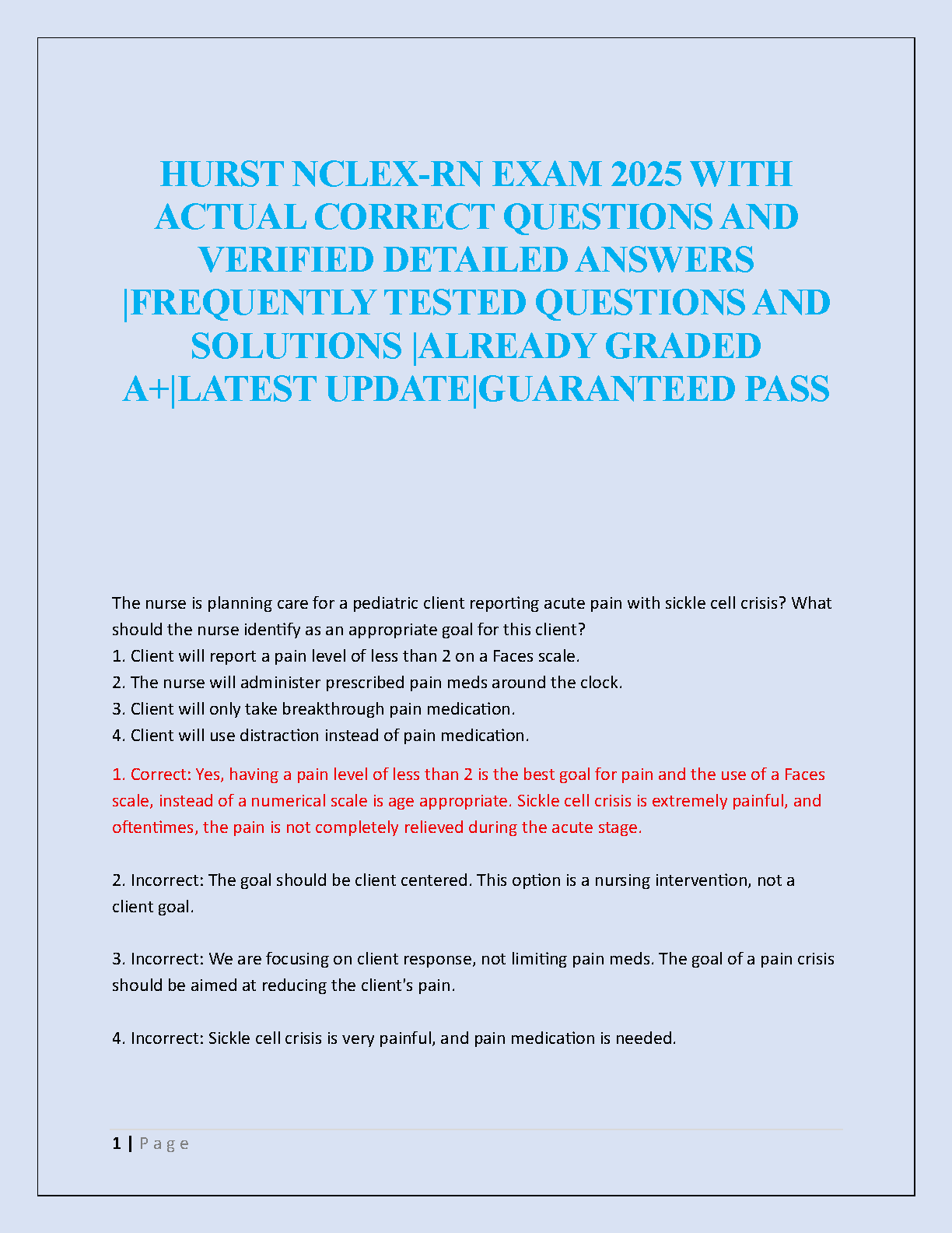 Ace the NCLEX-RN on your first try with the ultimate study companion for 2025! This comprehensive test bank, based on the renowned Hurst Review, provides a vast collection of frequently tested questions and meticulously detailed, verified answers. Each question comes with a clear rationale, just like the example provided for pediatric sickle cell crisis, helping you master critical nursing concepts. This A+ graded resource is your key to understanding the material, building confidence, and passing the NCLEX-RN exam with flying colors.