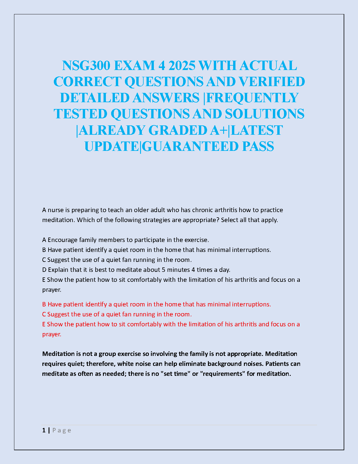 Prepare to excel in your NSG300 course with our latest Exam 4 Test Bank for the 2025-2026 academic year. This comprehensive resource is packed with a wide range of actual exam questions, each accompanied by a verified, detailed answer and rationale. Designed to cover all essential topics, this study guide has been proven to help students achieve an A+ grade. Don't leave your success to chance—use this expertly compiled material to study smarter, master the content, and pass your exam on the very first attempt, avoiding costly resits. Instant download available after purchase.