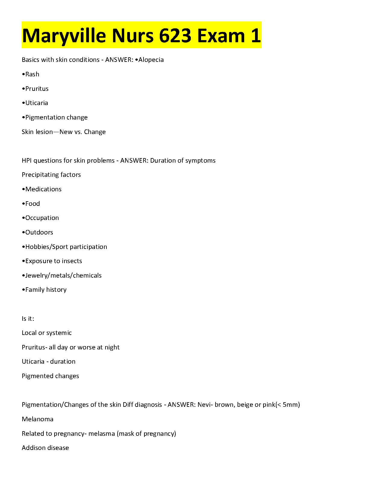 Master the first exam for Maryville University's NURS 623 Advanced Health Assessment course with our comprehensive exam elaboration, fully updated for the 2025/2026 academic year. This guide provides detailed notes and verified answers on crucial topics, including the basics of skin conditions, key HPI questions for dermatological problems, precipitating factors, and essential differential diagnoses for pigmentation changes. Designed to streamline your study process, this resource is your key to acing the exam on the first attempt and building a strong foundation in advanced health assessment.