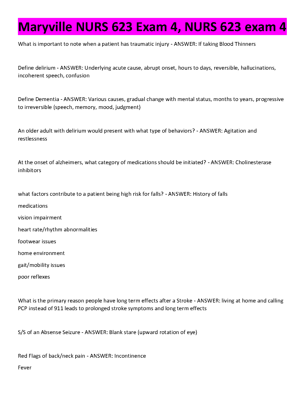 Ace your Maryville University NURS 623 Exam 4 with this comprehensive and expertly crafted study guide for the 2025/2026 academic year. This resource provides a detailed set of questions and verified answers covering crucial topics in Adult-Gerontology Primary Care, including the assessment of delirium vs. dementia, Alzheimer's medications, fall risk factors, stroke after-effects, and critical red flags. Designed to help you master the material and pass your exam on the first attempt, this exam elaboration is the ultimate tool for success.