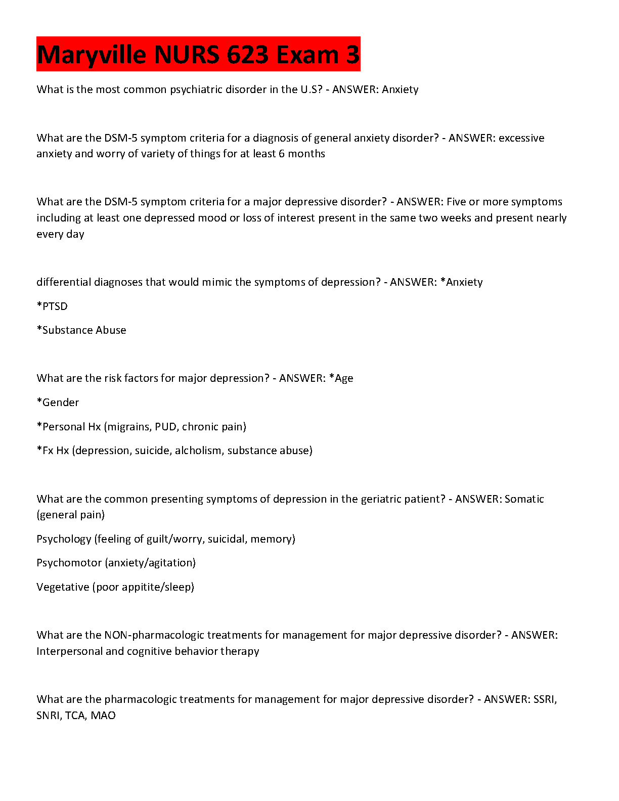 Ace your psychiatric nursing exam with this comprehensive study guide! Specifically tailored for Maryville University's NURS 623 Exam 3, this resource provides detailed questions and verified answers on essential topics like anxiety, major depressive disorder, DSM-5 criteria, differential diagnosis, risk factors, and treatment modalities. Updated for the 2025/2026 academic year, this guide is your key to understanding complex concepts and passing your exam on the first try. Master the material efficiently and walk into your exam with confidence.