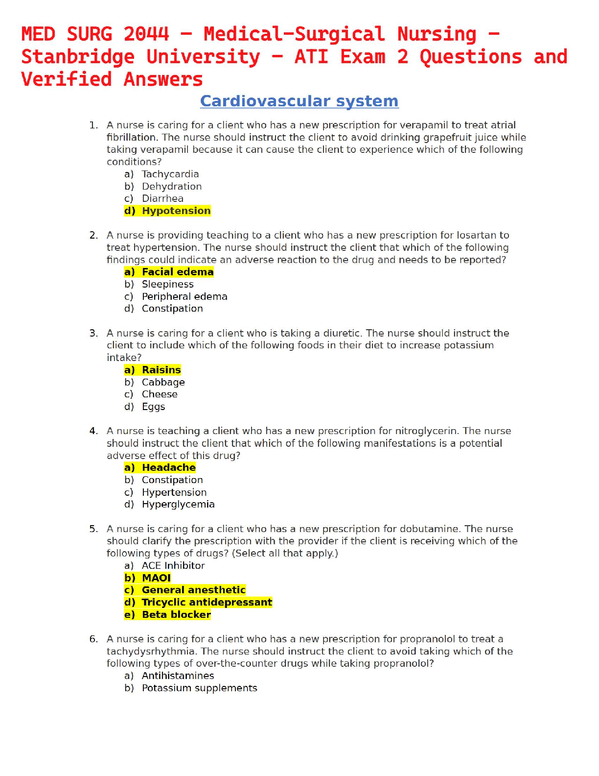 ATI Med Surg Exam 2: Cardiovascular System | Stanbridge University MED SURG 2044 | Questions with Verified Answers