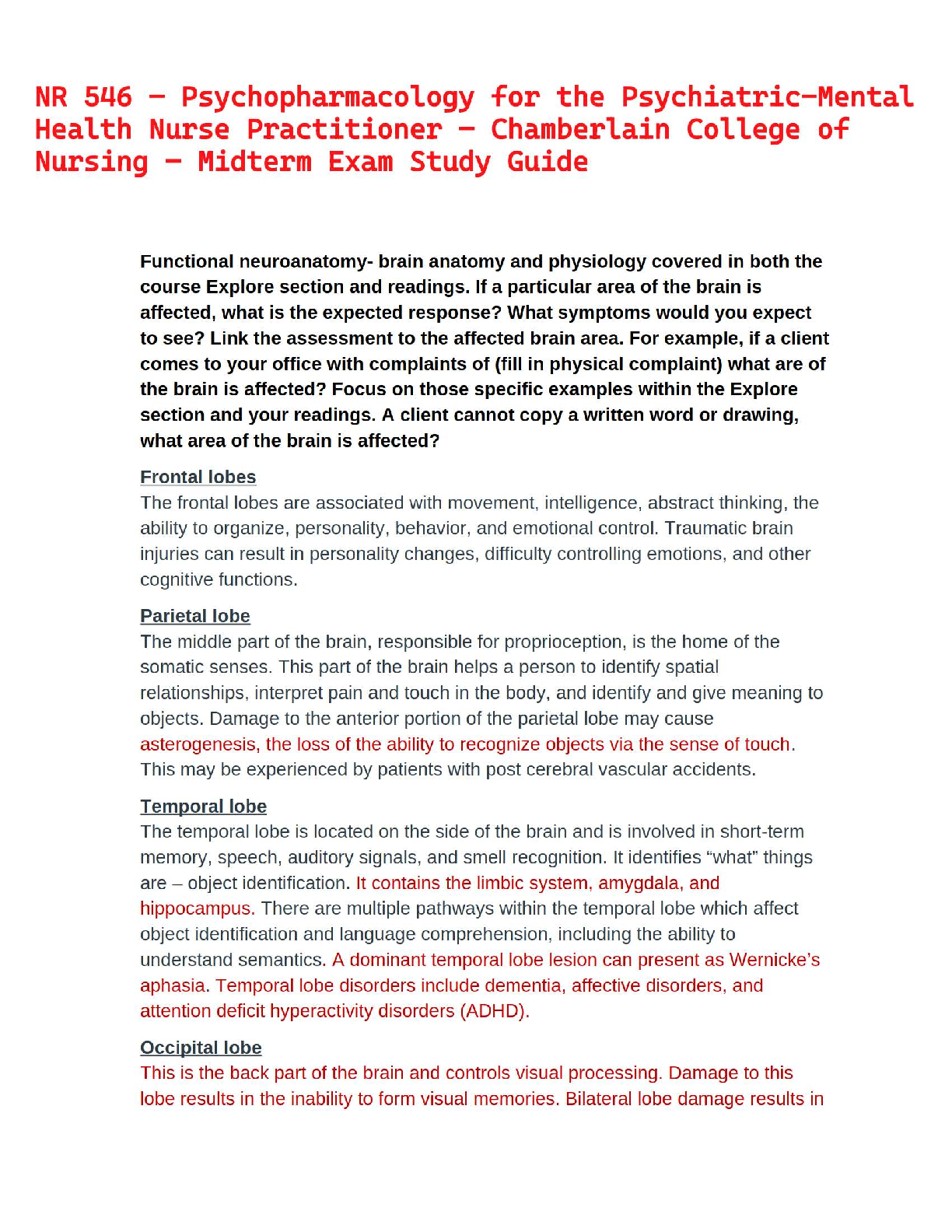 Get ready to master your NR 546 Midterm Exam with this ultimate study guide for the 2025/2026 academic year. Designed specifically for students in the Chamberlain College of Nursing's Psychiatric-Mental Health Nurse Practitioner program, this guide covers all essential topics in Psychopharmacology. Dive deep into complex subjects like functional neuroanatomy, exploring the critical functions of the frontal, parietal, temporal, and occipital lobes and the clinical implications of their dysfunction. This comprehensive resource is structured to help you understand, retain, and apply key concepts, ensuring you pass your exam with confidence on your first attempt and avoid any resits. Download now to secure your success in NR 546.