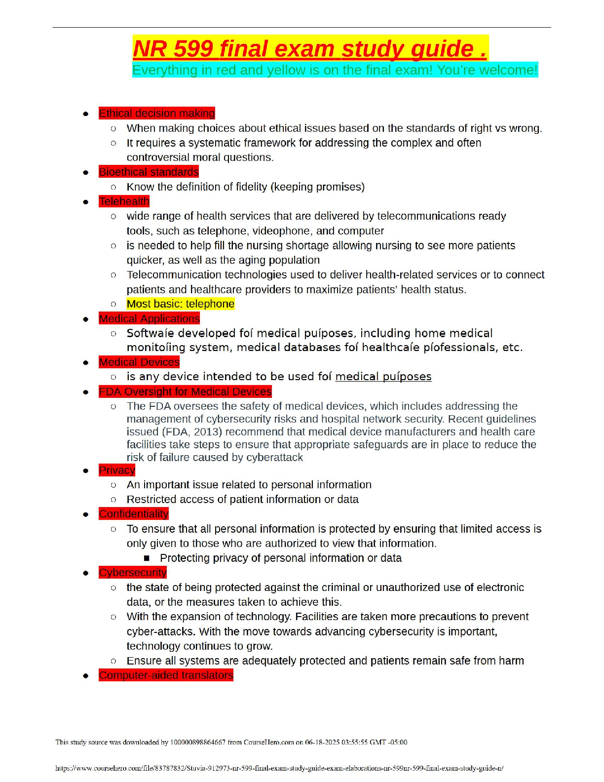 Struggling with NR 599 Nursing Informatics? Master the final exam with our brand-new 2025/2026 study guide! This comprehensive guide covers all the critical topics guaranteed to be on your final exam. Gain a deep understanding of key areas including Telehealth, Bioethical Standards, Cybersecurity in healthcare, FDA regulations for medical devices, patient Privacy, and Confidentiality. Our expertly compiled notes highlight the most essential information, helping you study smarter, not harder. This is your key to passing the NR 599 final on your very first try. Download now and secure your grade!
