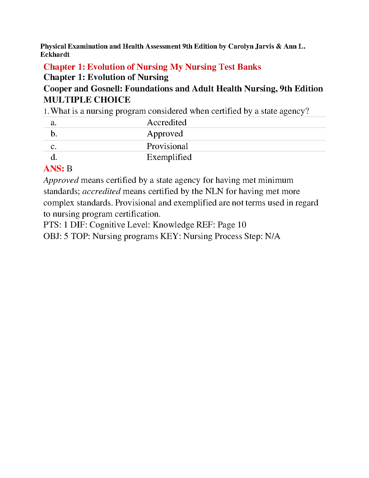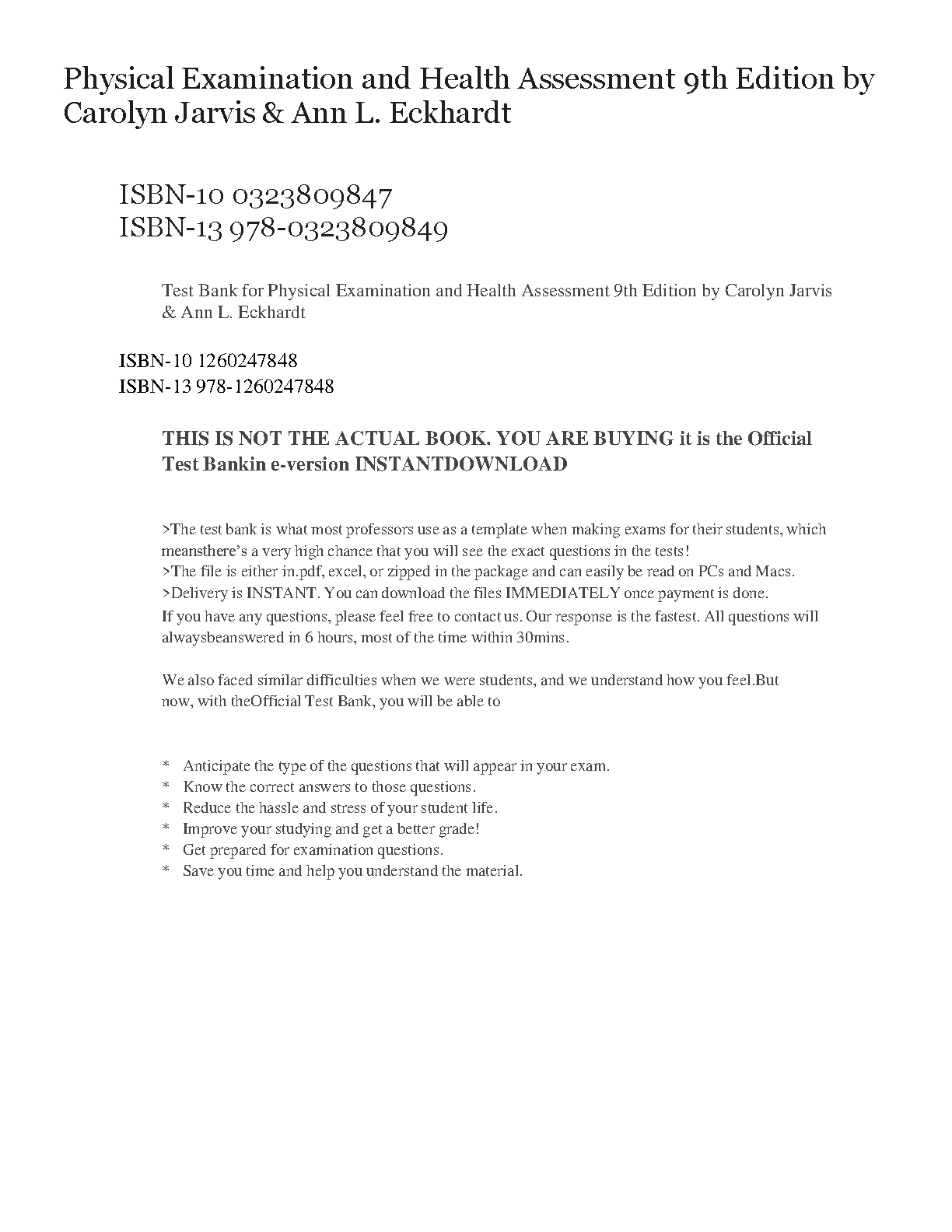 Unlock your full potential and ace your nursing exams with the complete Test Bank for Jarvis and Eckhardt's Physical Examination & Health Assessment, 9th Edition. This essential study resource provides an extensive collection of multiple-choice questions, fill-in-the-blanks, and critical thinking scenarios, all complete with detailed rationales and answers. Designed to mirror the actual exam format, this test bank helps you master key concepts in health assessment, diagnostic reasoning, and patient examination. Stop struggling and start studying smarter. Download the instant-access PDF today and gain the confidence to pass your course with flying colors.