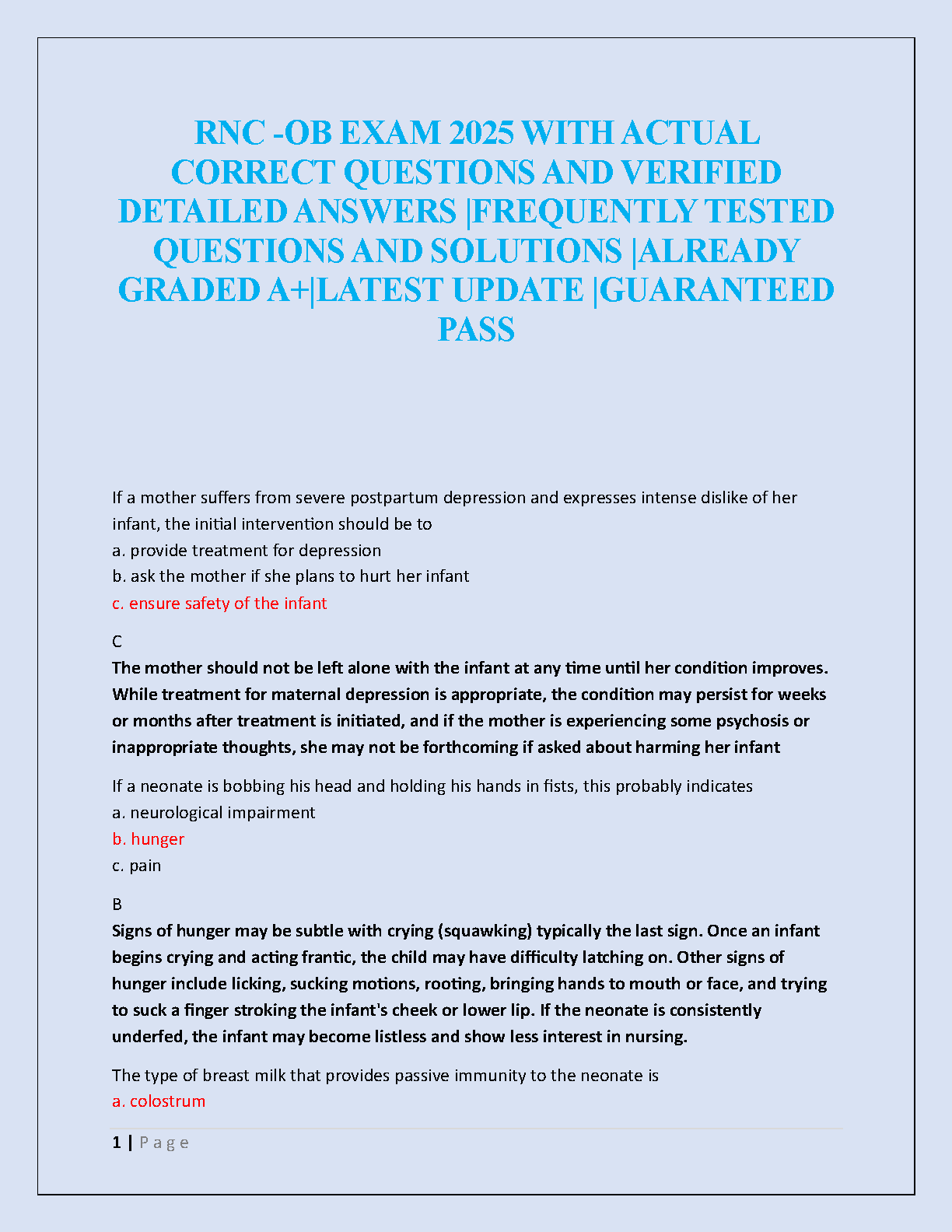 Prepare to ace your Inpatient Obstetric Nursing (RNC-OB) certification with our ultimate 2025 test bank! This guide is expertly designed to help you pass on your first attempt. It contains a comprehensive collection of actual exam questions, each with a 100% correct, verified answer and a detailed, easy-to-understand rationale. Master key concepts in postpartum care, neonatal assessment, and more. This latest A+ graded resource guarantees you have the most up-to-date material to walk into your exam with confidence and secure your certification.