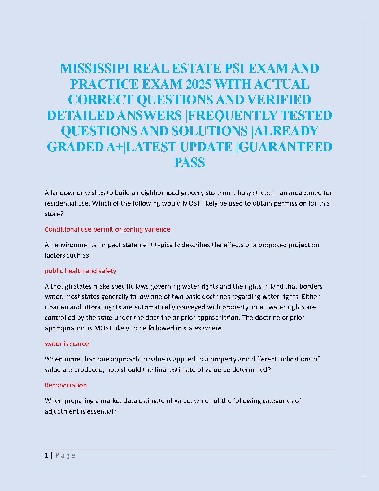Get ready to ace your Mississippi Real Estate PSI Exam with our latest 2025/2026 edition test bank! This comprehensive study guide is packed with actual exam questions and meticulously verified answers. We've focused on the most frequently tested topics to ensure you're fully prepared. Achieve an A+ grade and pass on your first attempt, avoiding costly and time-consuming resits. This is the ultimate resource for aspiring real estate professionals in Mississippi to guarantee success.