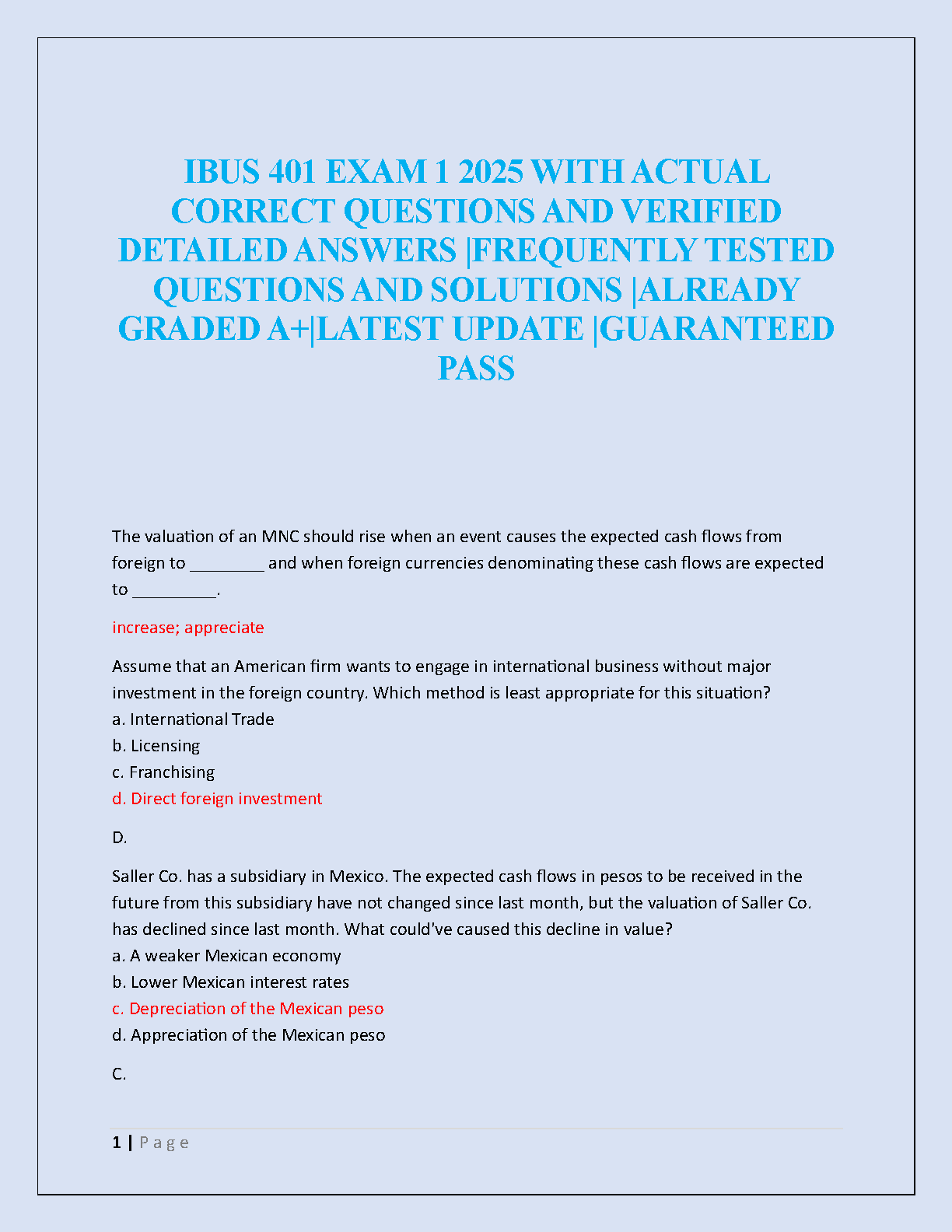 Ace your IBUS 401 Exam 1 with this comprehensive test bank for 'International Business: Competing in the Global Marketplace', 14th Edition by Charles W. L. Hill and G. Tomas M. Hult. This essential study resource provides a complete set of frequently tested exam questions, complete with detailed, verified answers and solutions. Designed to help you master key concepts in international trade, foreign investment, and MNC valuation, this guide is your key to achieving an A+ grade. Stop struggling and start studying smarter. Download now to prepare effectively, pass your exam on the first attempt, and avoid resits!