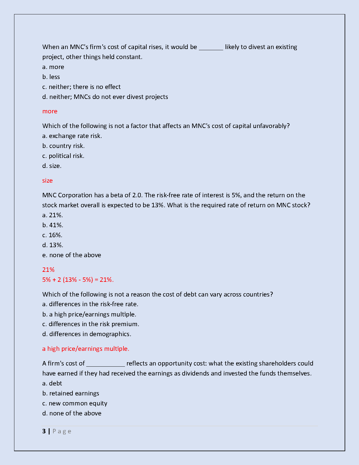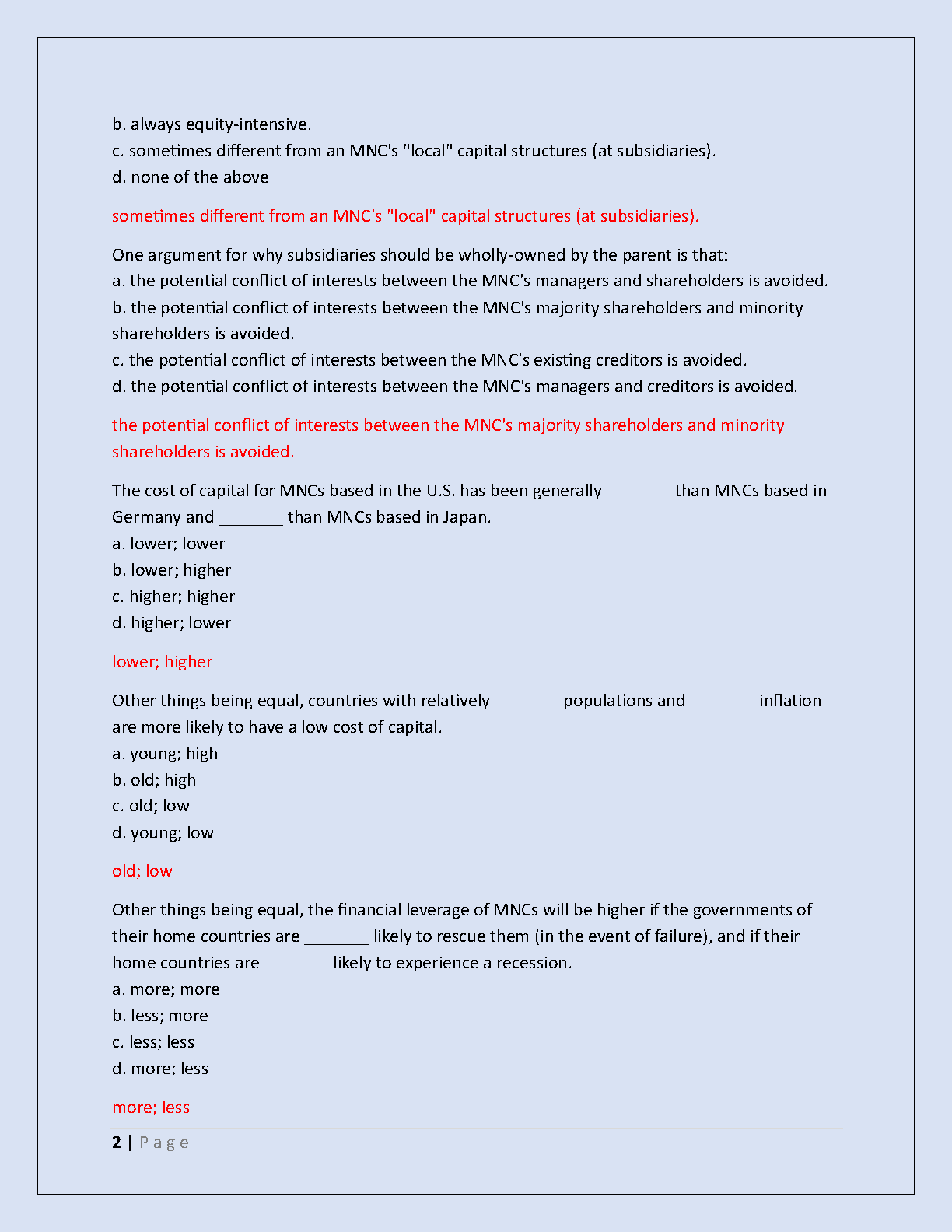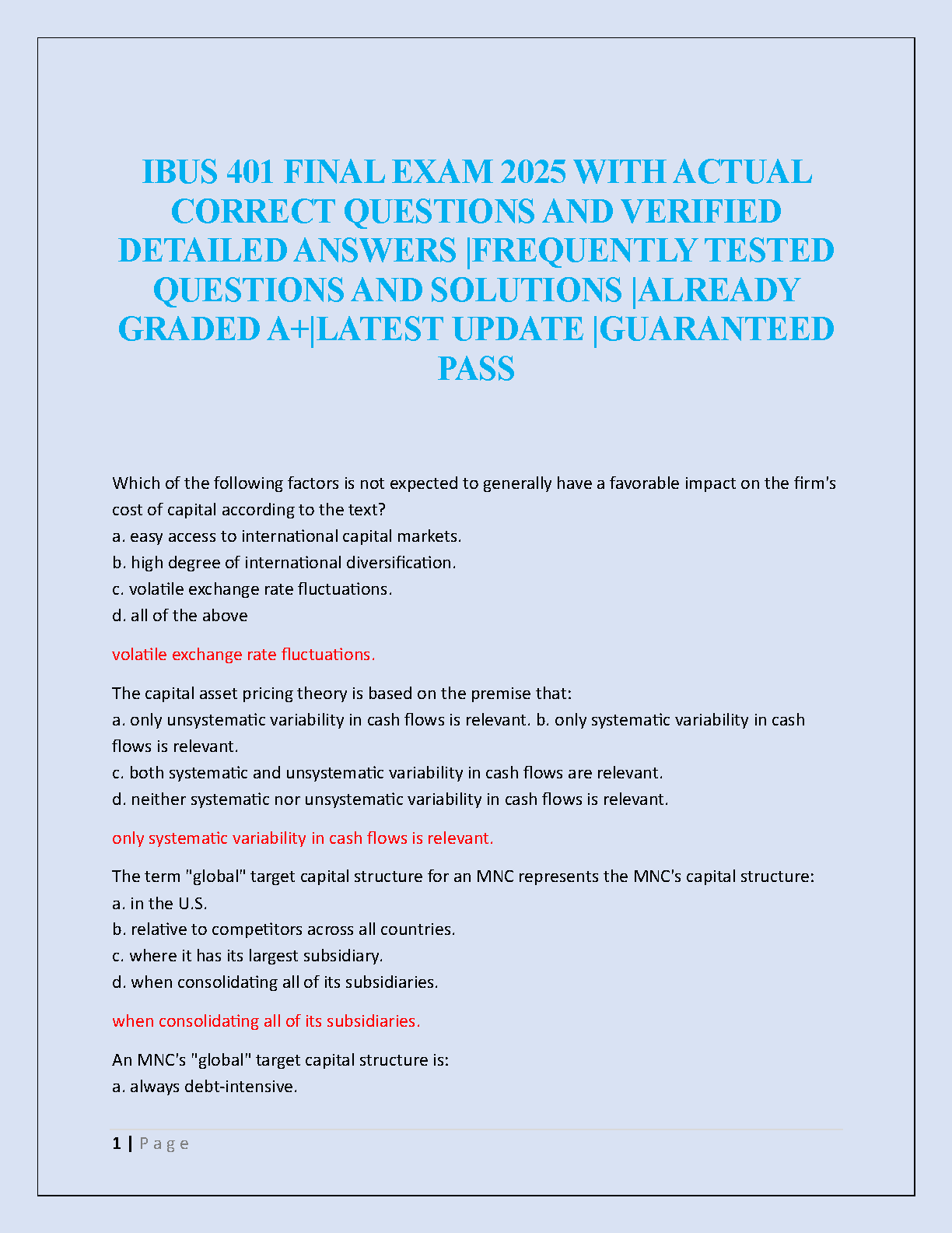 Ace your IBUS 401 Final Exam with our comprehensive 2025/2026 test bank! This ultimate study guide is packed with actual exam questions and meticulously verified, detailed answers. Our resource covers all frequently tested topics in international business finance, such as cost of capital, capital asset pricing, and MNC capital structure. Designed to help you master key concepts for an A+ grade, this guide is your key to passing on the first attempt and avoiding resits. Get the latest updated material and walk into your exam with confidence!