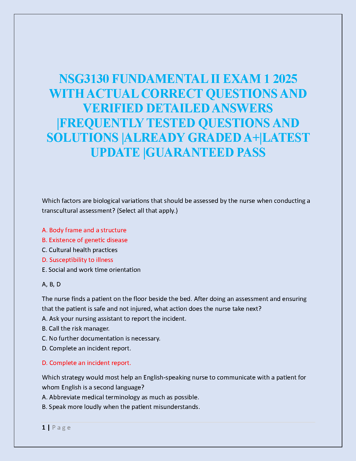 Ace your NSG 3130 Fundamental II Exam 1 with our comprehensive test bank for the 2025/2026 academic year. This guide features a collection of actual, frequently tested questions with verified, detailed answers to help you master the course material. Designed to reflect the real exam, this A+ graded resource guarantees you have the most accurate and effective study tool to pass on your first attempt. Download now and secure your success in Fundamental Nursing.