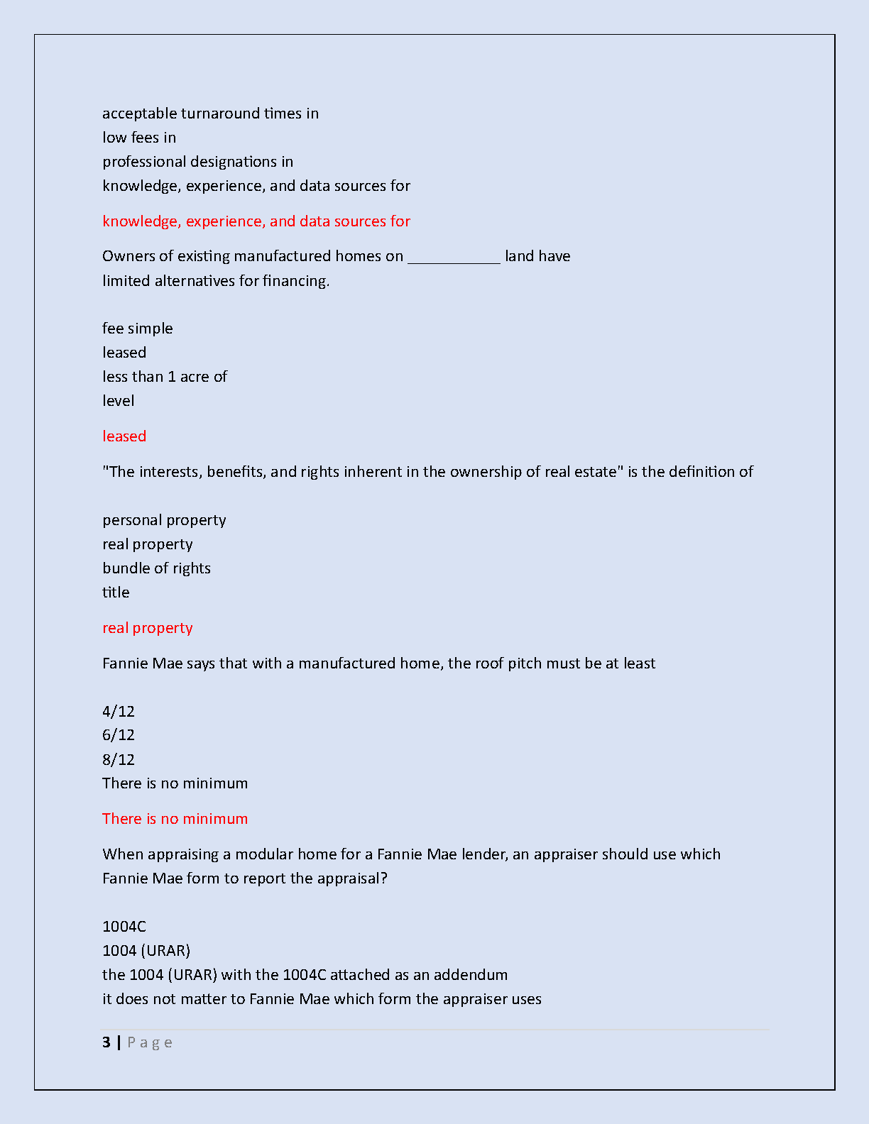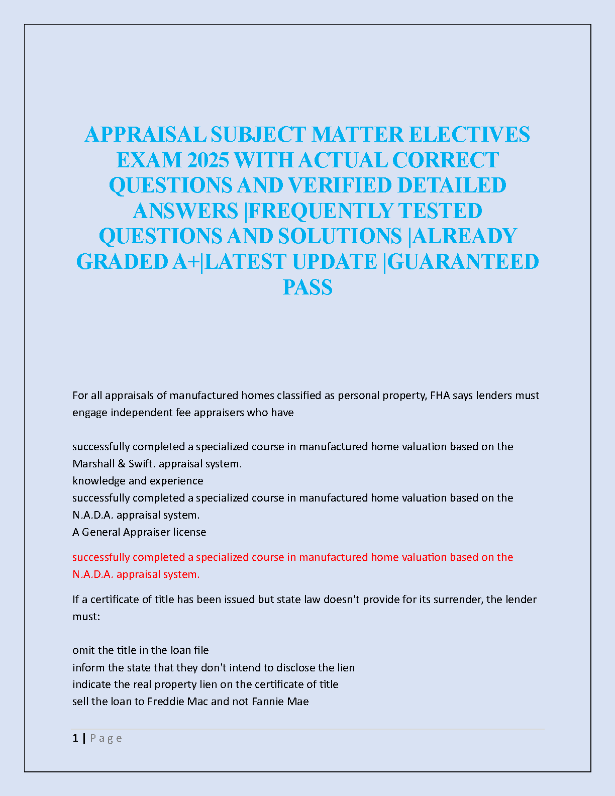 Ace your Appraisal Subject Matter Electives Exam on the very first try! This is the latest, fully updated test bank for the 2025-2026 academic year, meticulously crafted to ensure your success. Inside, you'll find a comprehensive collection of actual exam questions, each paired with a verified, detailed answer and solution. Our resource covers frequently tested topics, including the nuances of FHA appraisals for manufactured homes and various appraisal systems. This A+ graded guide is your key to mastering the material, boosting your confidence, and passing with flying colors. Don't risk a resit – prepare with the best and guarantee your pass!