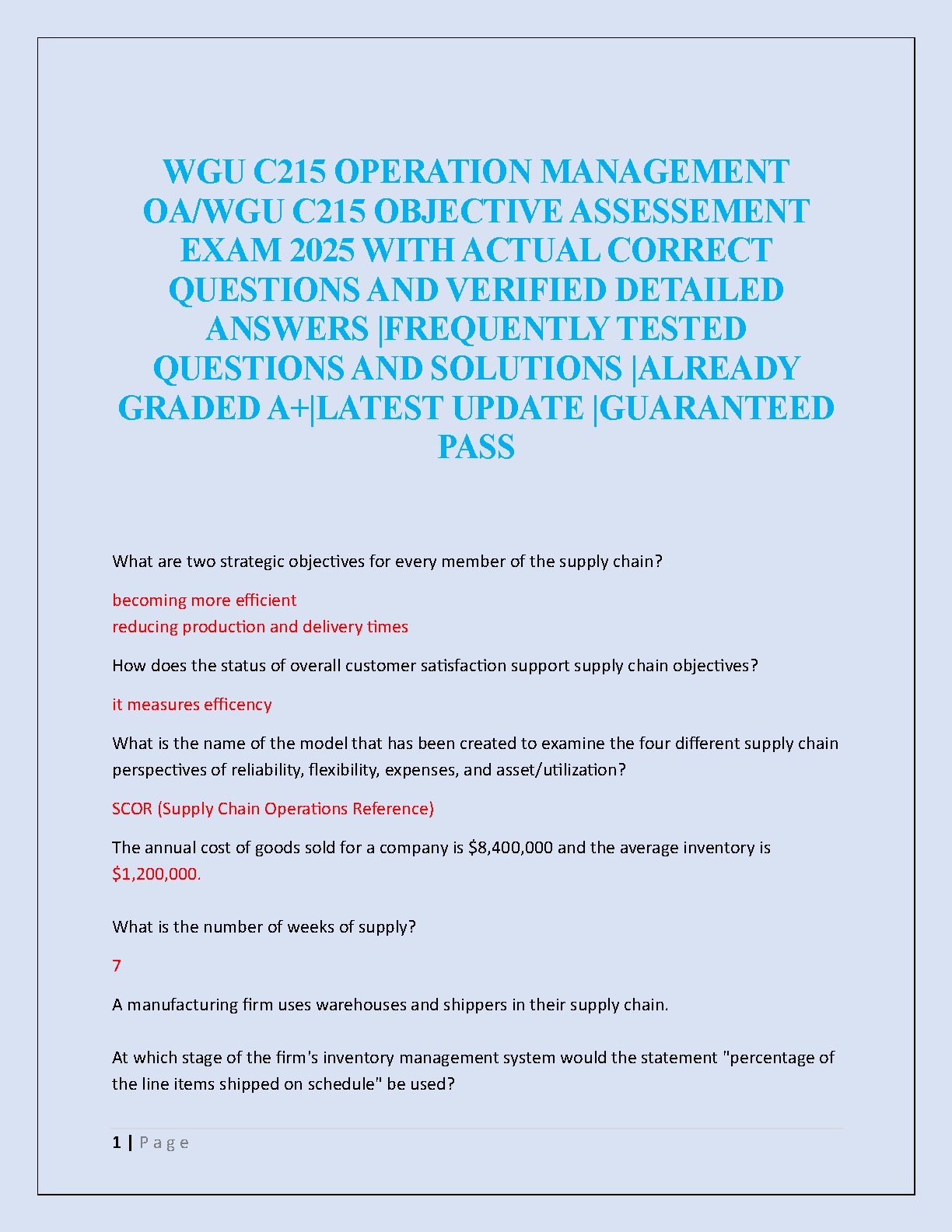 Prepare to excel in your WGU C215 Operation Management Objective Assessment with our comprehensive and up-to-date test bank for the 2025/2026 academic year. This essential study guide features a complete collection of actual exam questions, each accompanied by a detailed, verified answer. Our resource covers all key topics from the C215 curriculum, including supply chain strategy, inventory management, and operational efficiency. Designed to help you pass on your first attempt and avoid costly resits, this guide is your key to achieving an A+ grade. Stop guessing and start studying with the most reliable and frequently tested questions and solutions available. Secure your success in Operation Management today!