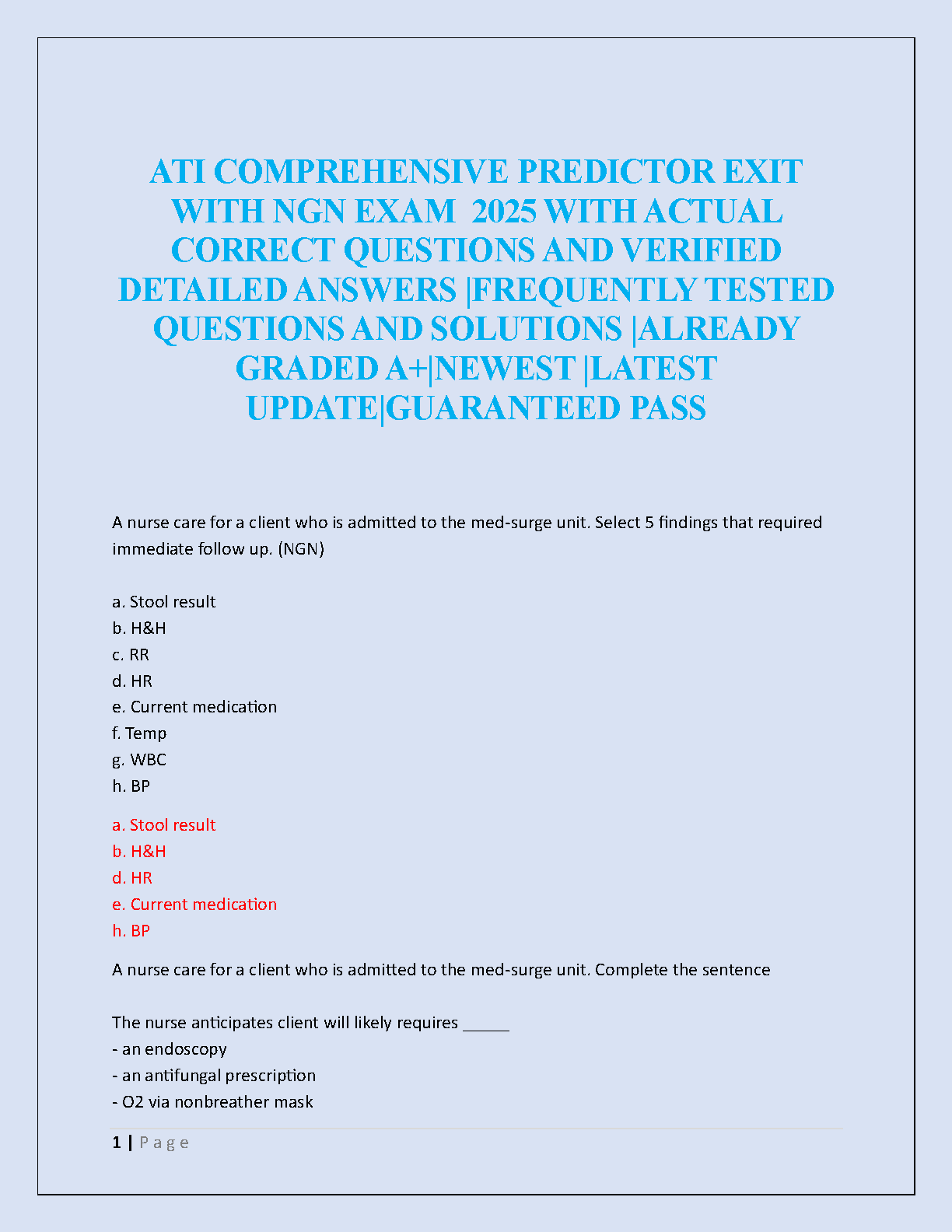 Master the ATI Comprehensive Predictor NGN Exit Exam with our latest 2025 test bank. This comprehensive resource is packed with actual, frequently tested questions and verified, detailed answers to ensure you're fully prepared. Designed for nursing students aiming for a guaranteed pass and an A+ grade, this guide covers all essential topics and incorporates the latest Next Generation NCLEX (NGN) question formats. Stop struggling and start studying smart. Download now to gain the confidence you need to ace your exit exam and launch your nursing career!