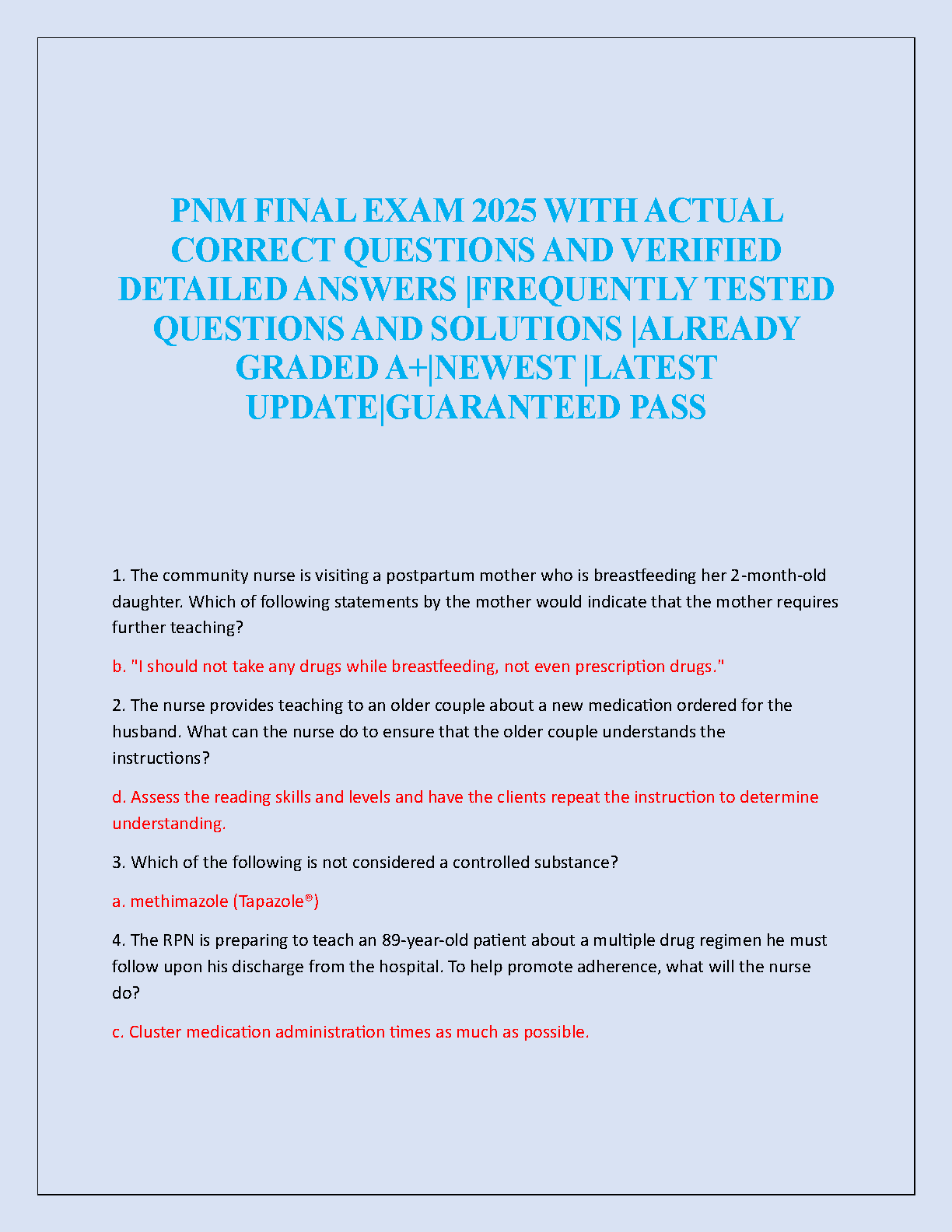 Excel in your nursing studies with our latest PNM Final Exam Test Bank for the 2025/2026 academic year. This comprehensive study resource features a complete collection of frequently tested questions, each with a correct, verified answer and detailed solution. Designed to help you achieve an A+ grade, this guide is your key to passing the PNM final exam on your first attempt. Get immediate access to the most up-to-date material and study with confidence!