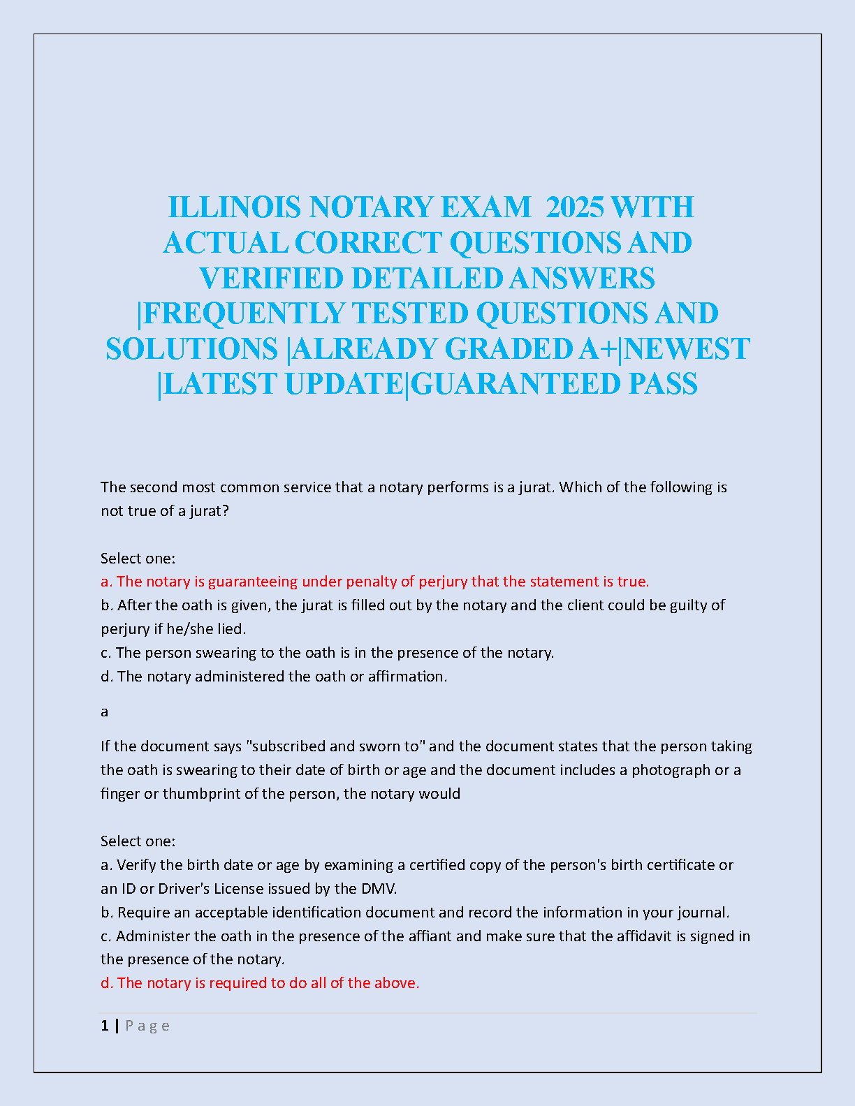 Ace your Illinois Notary Public Exam in 2025 with our premier test bank. This comprehensive study guide features a collection of actual exam questions, each with verified, detailed answers. Our resource focuses on frequently tested topics to ensure you're fully prepared. Updated for the latest exam version and already graded A+, this test bank is your key to passing with confidence on your first attempt. Eliminate exam anxiety and guarantee your success!