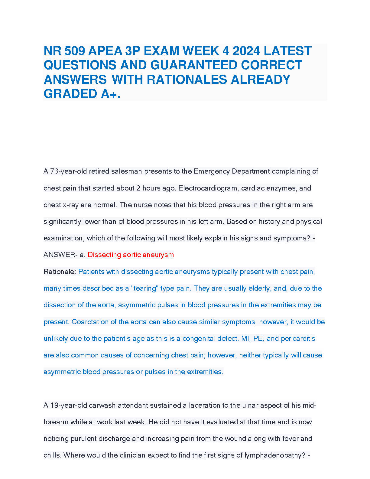 Master your NR 509 APEA 3P Week 4 exam with our comprehensive study guide, fully updated for the 2025/2026 academic year. This resource provides a complete set of the latest exam questions, accompanied by guaranteed correct answers and in-depth rationales that explain the 'why' behind each solution. Designed to help you achieve an A+ grade, this guide is your key to understanding complex clinical scenarios and passing your exam confidently on the first attempt. Avoid the stress of resits and secure your success with this essential study tool.