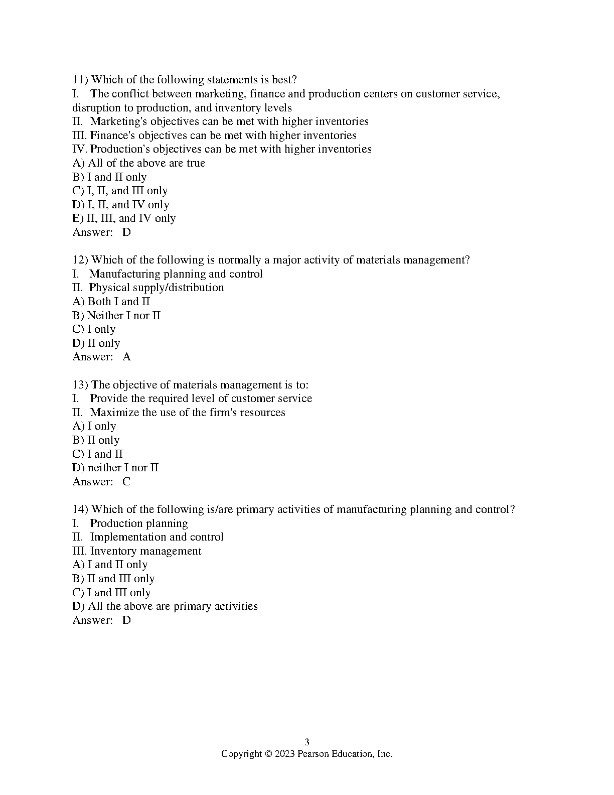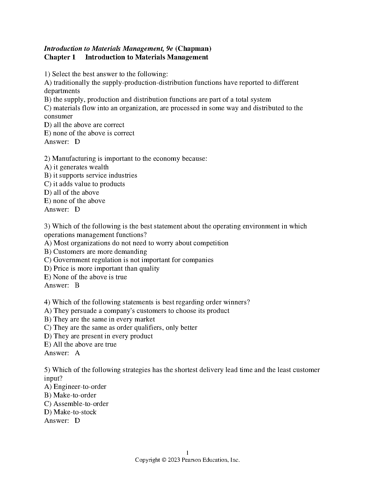 Test Bank for Introduction to Materials Management, 9th Edition by J. R. Tony Arnold, Stephen N. Chapman, and Lloyd M. Clive