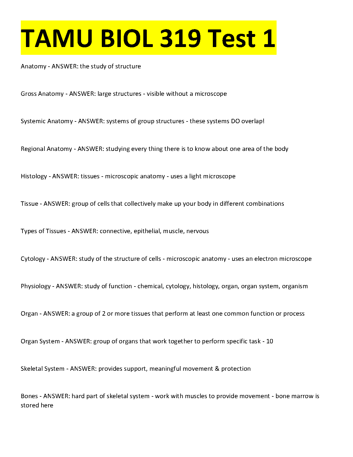 TAMU BIOL 319 Test 1 - Human Anatomy Exam Study Guide | Latest 2025/2026 Q&A to Help You Pass on the First Attempt