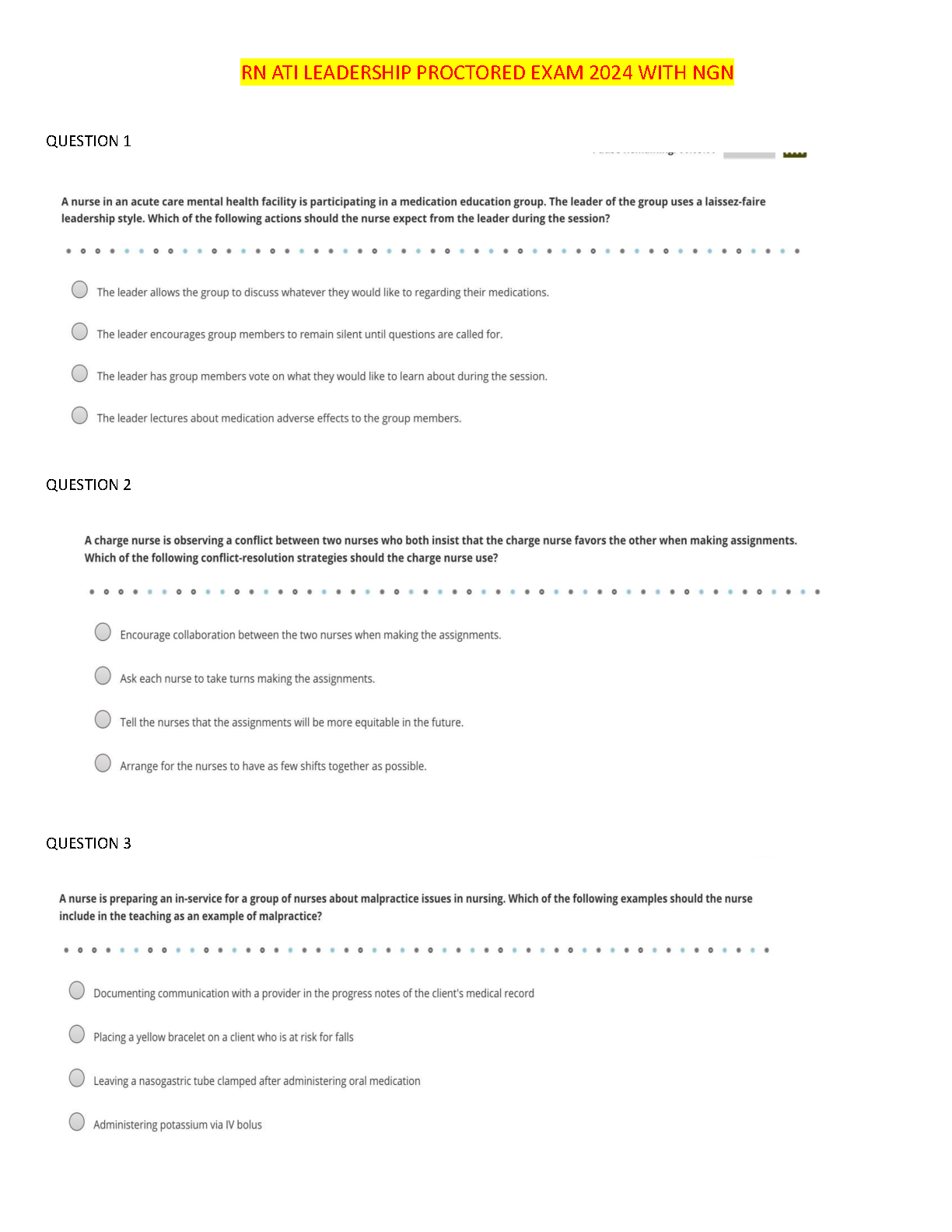 ATI RN Leadership Proctored Exam 2024 Test Bank: NGN Edition by Assessment Technologies Institute to Ace Your Exam