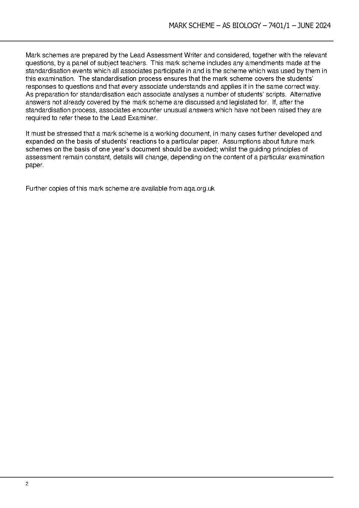 Get the official AQA AS Biology Paper 1 (7401/1) Mark Scheme from the June 2024 exam series. This essential resource provides detailed answers and marking criteria, offering invaluable insight into how examiners award marks. By studying this mark scheme, you can understand exactly what is required for top grades, refine your exam technique, and identify key areas for improvement. This is the ultimate tool to prepare for your upcoming 2025/2026 exams, helping you to pass with confidence on your first attempt and avoid costly resits. Download now to boost your revision and secure the best possible grade.