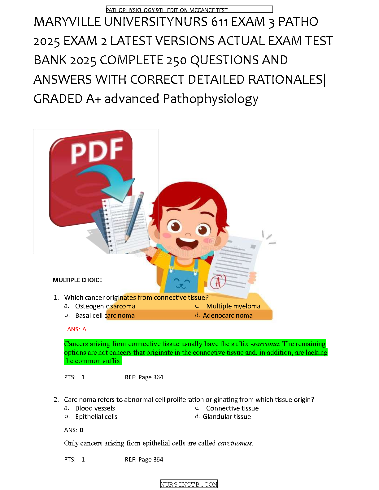 Master your Advanced Pathophysiology course and guarantee exam success with this comprehensive test bank for NURS 611 at Maryville University. Directly aligned with 'Pathophysiology, 9th Edition' by Kathryn L. McCance & Sue E. Huether, this resource provides over 250 practice questions. Each question comes with a detailed, correct rationale to solidify your understanding of complex concepts. This is the ultimate tool to help you study efficiently, achieve an A+ grade, and pass Exam 3 on your very first attempt. Get immediate access to the latest, verified exam materials.