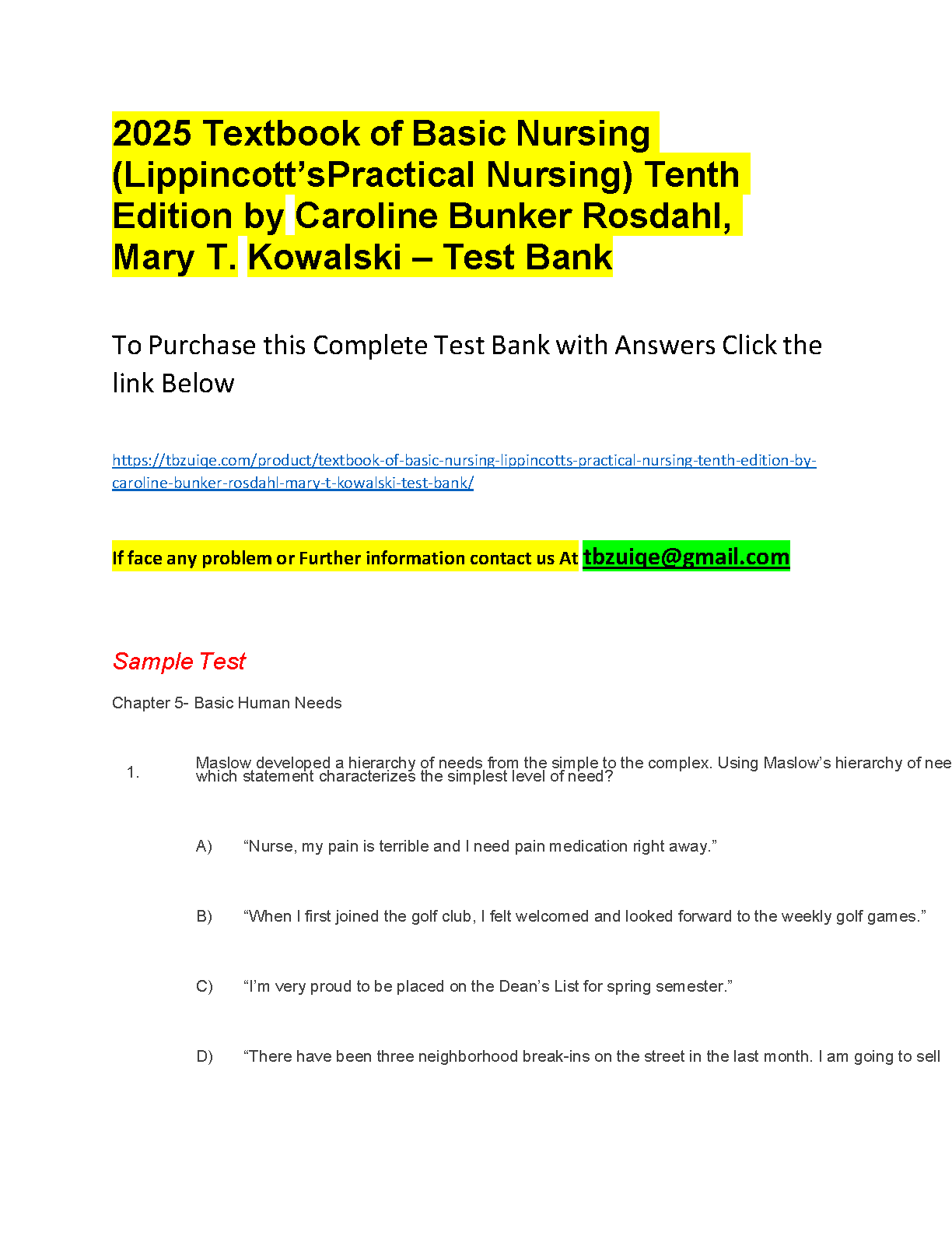 Unlock your full potential and excel in your nursing studies with the complete Test Bank for the Tenth Edition of 'Textbook of Basic Nursing' by Caroline Bunker Rosdahl and Mary T. Kowalski. This essential resource, from the trusted Lippincott's Practical Nursing series, provides a comprehensive collection of practice questions and answers that mirror the actual exam format. Covering all key chapters, this test bank is designed to deepen your understanding, reinforce critical concepts, and fully prepare you to pass your exams with confidence.