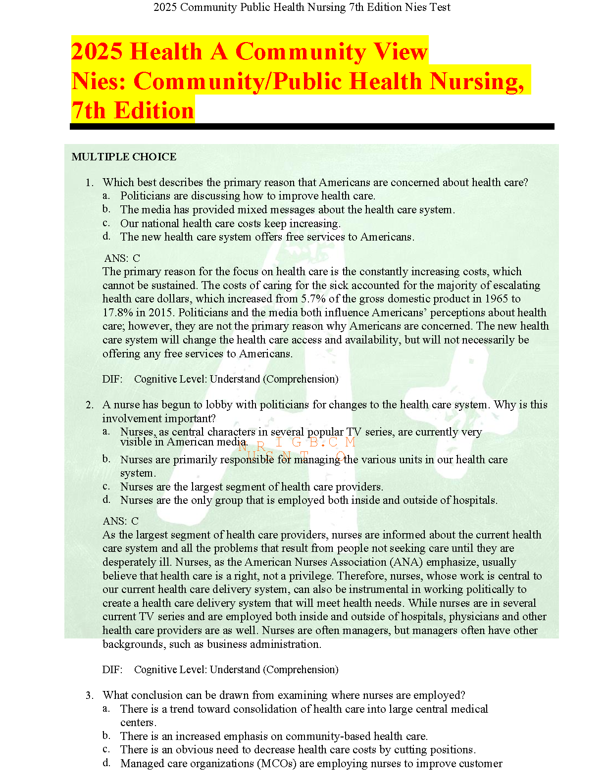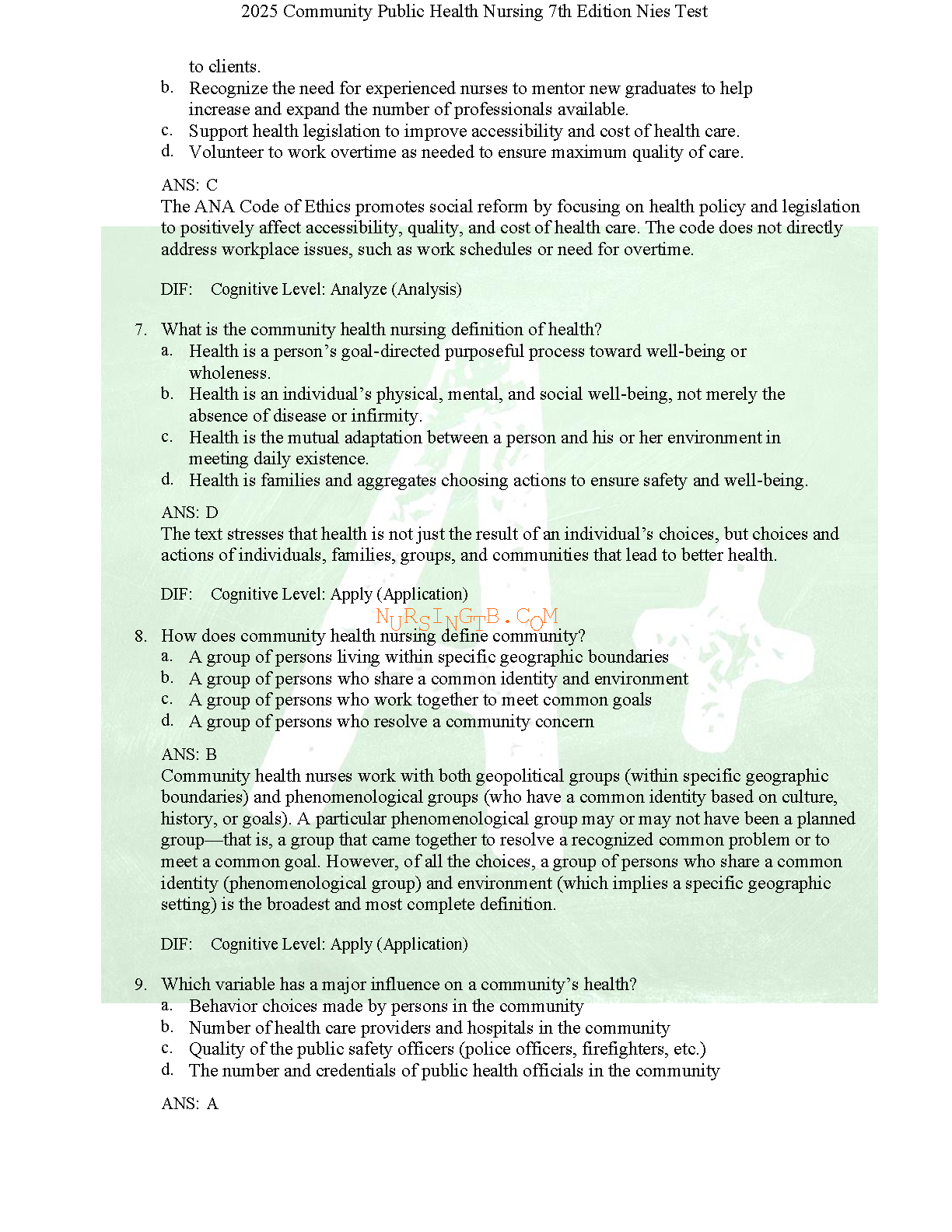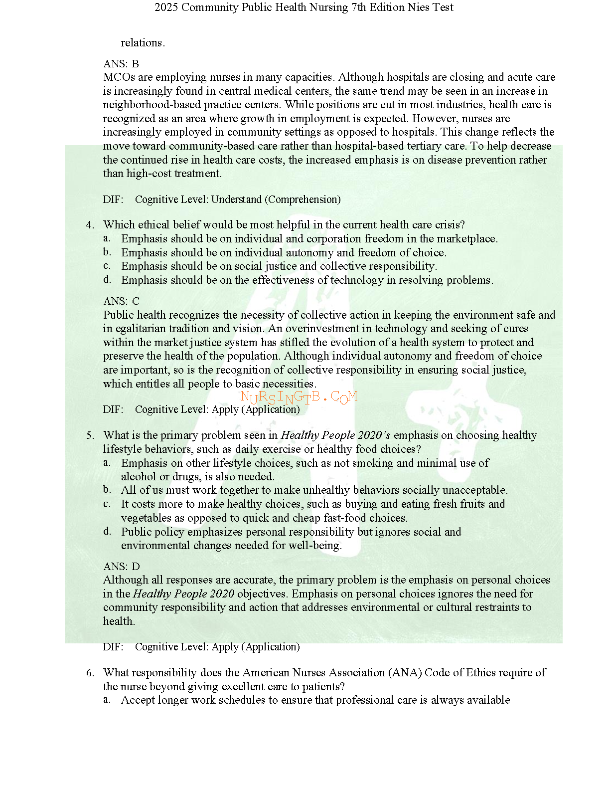 Achieve academic excellence with the authentic Test Bank for 'Community/Public Health Nursing, 7th Edition' by Mary A. Nies and Melanie McEwen. This indispensable study resource offers a complete collection of exam-style questions, detailed answers, and comprehensive rationales for all chapters. It is expertly crafted to help you master crucial concepts, prepare effectively for exams, and build the confidence needed to succeed in your nursing course. Download now to gain an edge in your studies and pass your exams on the first try.