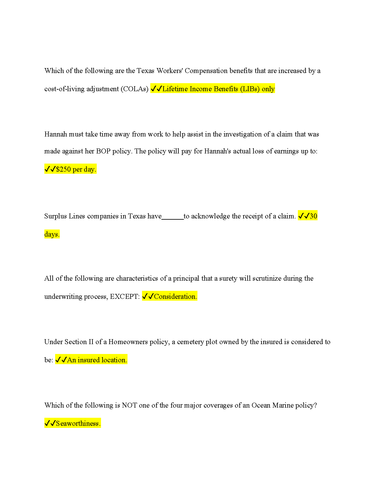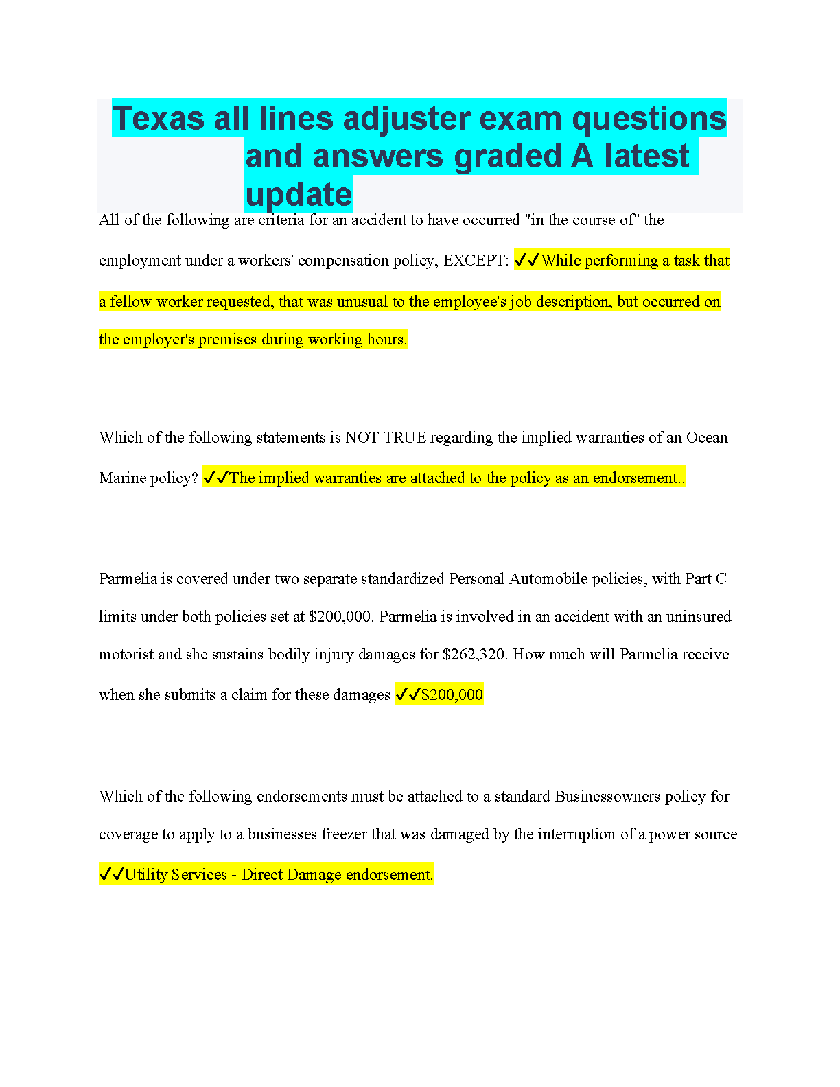 Ace your Texas All Lines Adjuster exam with confidence using our newly updated 2025/2026 study resource. This guide is packed with a comprehensive set of exam questions and verified, A-grade answers covering all essential topics, including workers' compensation, marine policies, and more. It's strategically designed to provide you with the knowledge and practice needed to pass your certification on the first try, saving you from the stress and cost of resits. Get the ultimate prep tool and secure your adjuster license successfully.