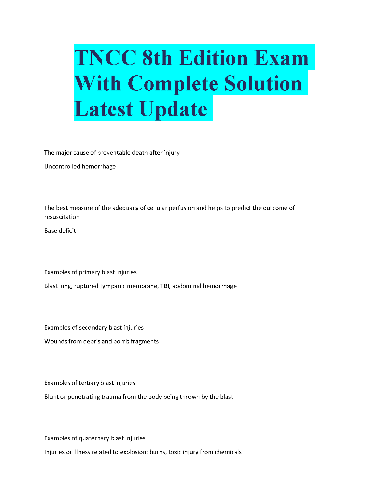 Ace your TNCC certification with our comprehensive test bank for the Trauma Nursing Core Course, 8th Edition, developed by the Emergency Nurses Association (ENA). This essential study resource provides a complete collection of exam questions paired with detailed, verified solutions, covering all critical areas of trauma nursing, including initial assessment, blast injuries, hemorrhage control, and resuscitation outcomes. Designed to mirror the actual exam format, this test bank is your ultimate tool for effective preparation, helping you master the material, build confidence, and pass your TNCC 8th Edition exam on your first attempt.